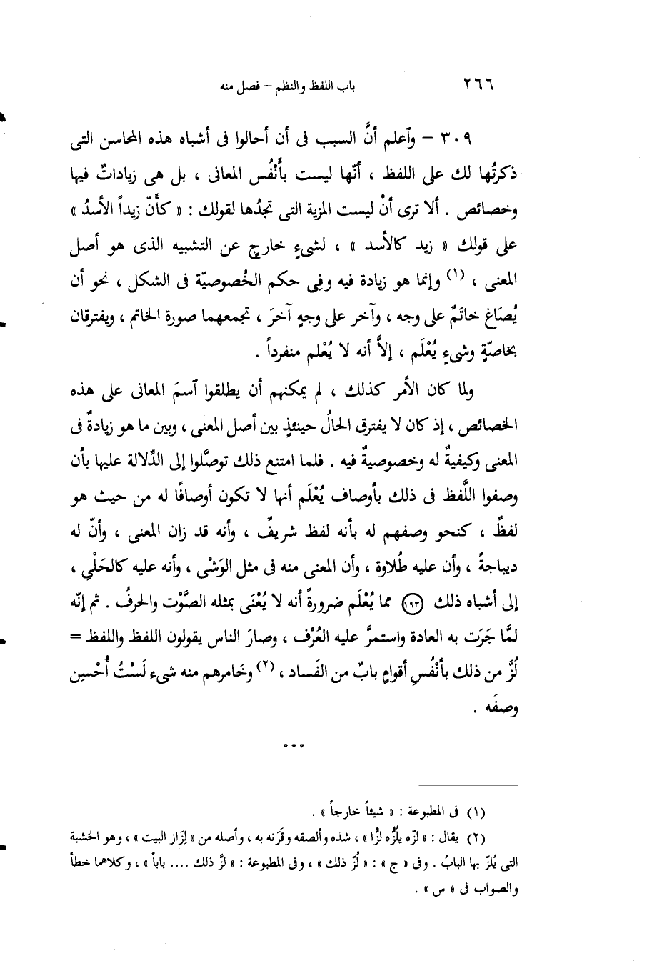 309 - واعلمْ أنَّ السببَ في أَنْ أَحالوا في أشباهِ هذِه المحاسنِ التي ذكرْتُها لكَ على اللفظِ، أنها ليستْ بأنفُس المعاني، بل هي زياداتٌ فيها وخصائصُ. ألا ترى أنْ ليستِ المزيةُ التي تجدُهَا لِقولك: "كأنَّ زيداً الأسدُ" على قولك: "زيد كالأسد"، لشيء خارجٍ عن التشبيه الذي هو أصْل المعنى1، وإِنما هو زيادةٌ فيه وفي حُكْم الخصوصيَّةِ في الشَّكْلِ، نحْو أن يُصاغَ خاتمٌ على وجهٍ، وآخرُ على وجهٍ آخرَ، تَجمعُهما صورةُ الخاتَمِ، ويفترقان بخاصَّةٍ وشيءٌ يُعْلَم، إلاَّ أنه لا يُعْلَم منفرداً.