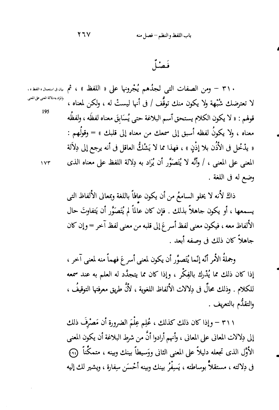 311 - وإذا كان ذلك كذلك، عُلِمَ عِلْمَ الضرورةِ أنَّ مصْرِفَ ذلك إِلى دلالات المعاني على المعاني، وأنهم أرادوا أنَّ مِن شَرْط البلاغة أنيكون المعنى الأولُ الذي تجعلُه دليلاً على المعنى الثاني ووَسيطاً بينَكَ وبينَه، متمكِّناً في دلالتِه، مستقلاً بوسّاطَتهِ، يَسْفُرُ بينَكَ وبينَه أحْسَنَ سِفارة، ويُشيرُ لك إليهِ