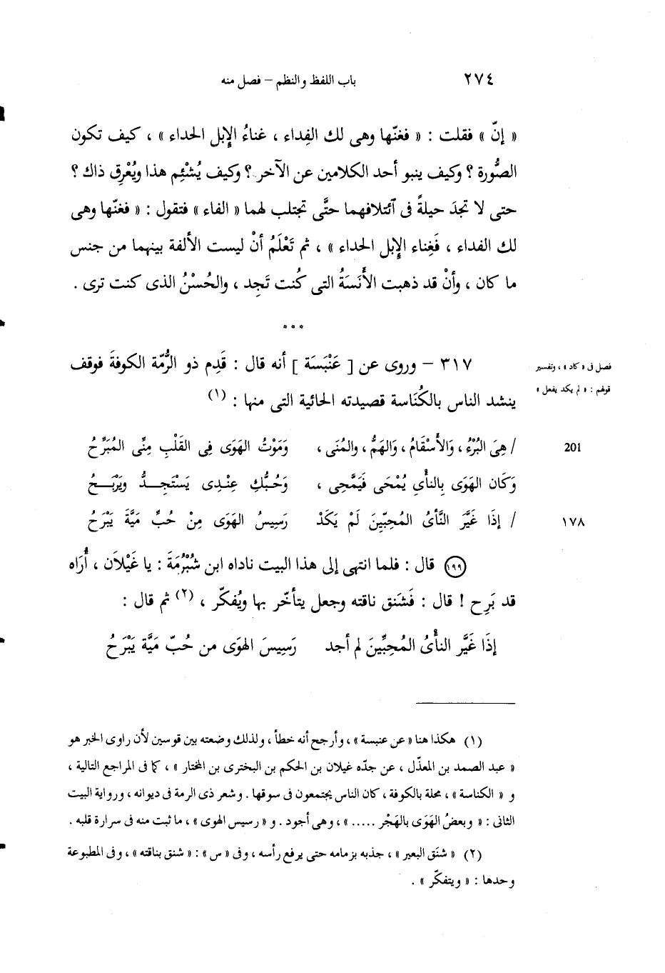 317 - ورويَ عن [عَنبسة] أنه قال: قدِمَ ذو الرمة الكوفةَ فوقفَ يُنشِدُ الناسَ بالكناسة قصيدته الحائية التي منها1: