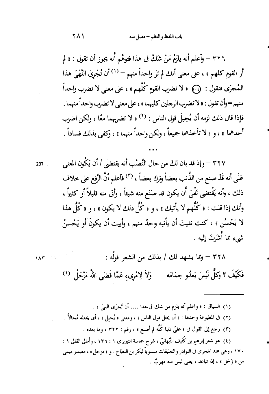 326 - واعلمْ أنَّه يَلزَمُ مَنْ شكَّ في هذا فتوهَّمَ أنَّه يجوزُ أن تقولَ: "لم أرَ القومَ كلَّهم"، على معنى أنك لم تَرَ واحداً منهم1 أن يُجْريَ النهيَ هذا المَجرى فتقولَ: "لا تَضْرب القومَ كلَّهم"، على معنى لا تضْربَ واحداً منهم وأن تقولَ: "لا تَضْربِ الرجلَيْن كليهما"، على معنى لا تَضْرِبْ واحد منهما. فإِذا قال ذلك لَزِمه أن يُحيلَ قولَ الناس2: لا تَضْرِبْهما معاً، ولكنِ اضْرِبْ أحدهما"، و "لا تأخذهما جميعًا، لكن واحداً منهما"، وكفى بذلك فساداً.