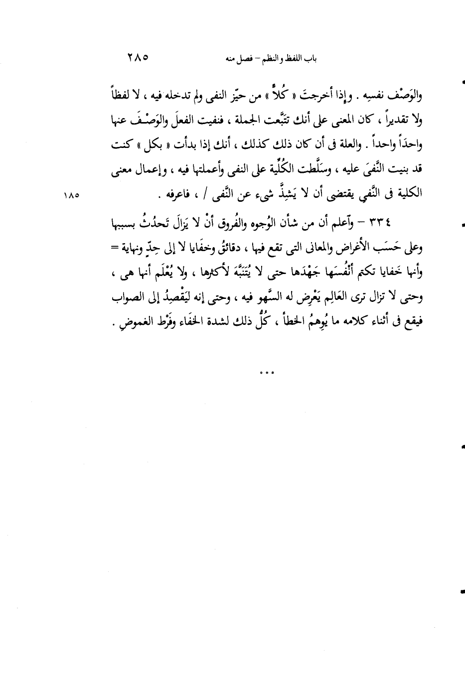 334 - واعلمْ أنَّ مِن شأنِ الوجوهِ والفُروقِ أنْ لا يزالَ يَحْدثُ بسببِها وعلى حَسبِ الأغراضِ والمعاني التي تَقَعُ فيها، دقائقُ وخفايا لا إِلى حدٍّ ونهايةٍ وأنَّها خفايا تكْتُم أنفُسَها جَهْدَها حتى لا يتنبه لأكثرِها، ولا يُعلَمُ أنها هي، وحتى لا تَزالُ تَرى العالِمَ يَعرِضُ له السهوُ فيه، وحتى إنه ليقصِدُ إلى الصواب فيقعُ في أثناء كلامه ما يوهم الخطأ، كل ذلك لشدة الخفاء وفرط الغموض.