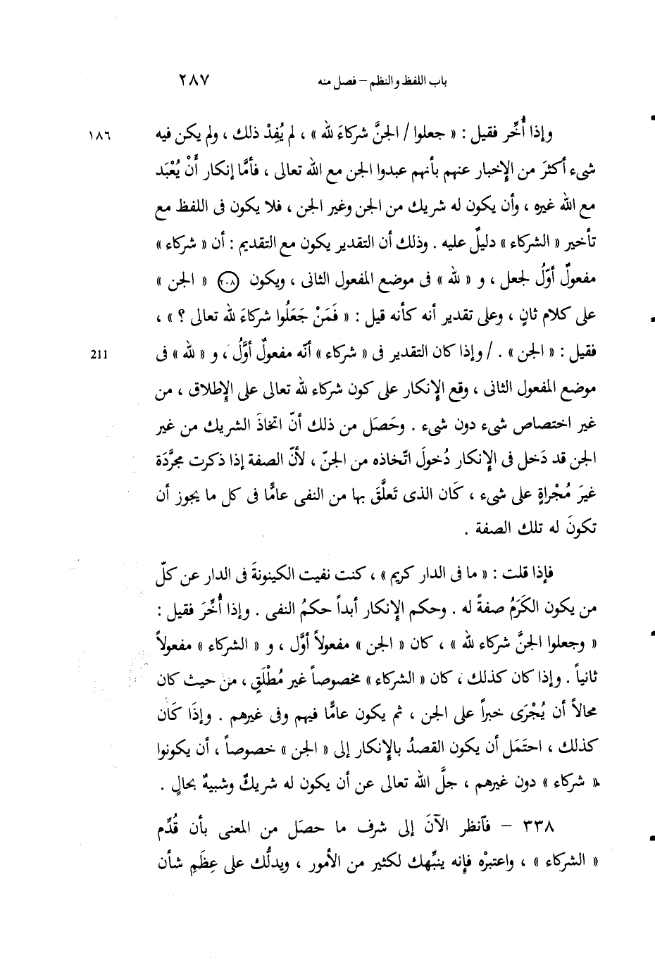 فإِذا قلتَ: "ما في الدار كريمٌ"، كنتَ نفَيْتَ الكينونَةَ في الدارِ عنْ كلِّ مَنْ يكون الكرَمُ صفةً له. وحكْمُ الإِنكارِ أبداً حكْمُ النفي. وإِذا أُخِّر فقيلَ: "وجعَلوا الجنَّ شركاءَ لله"، كان "الجنَّ" مفعولاً أولَ، و "الشركاء" مفعولاً ثانياً. وإِذا كان كذلك، كان "الشركَاء" مخصوصاً غيرَ مُطْلَق، من حيثُ كانَ مُحالاً أن يَجْريَ خبراً على الجنِّ، ثم يكونَ عامّاً فيهم وفي غيرهم. وإِذا كان كذلكَ، احْتَمَلَ أن يكونَ القصدُ بالإِنكار إِلى "الجنِّ" خصوصاً، أن يكونوا "شركاءَ" دون غيرهم، جل الله تعالى عن أن يكونَ له شريكٌ وشبيهٌ بحالٍ.