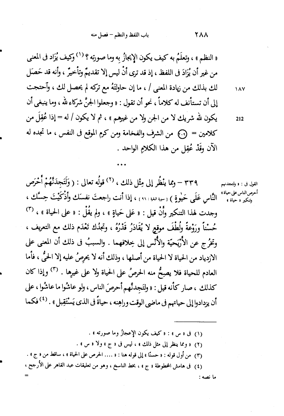 339 - ومما يُنظرُ إِلى مثلِ ذلكَ2، قولُه تعالى: {وَلَتَجِدَنَّهُمْ أَحْرَصَ النَّاسِ عَلَى حَيَاةٍ} [البقرة: 96] إِذا أنتَ راجعتَ نفسَك وأذكيتَ حسَّك، وجدتَ لهذا التنكيرِ وأنْ قِيلَ: "على حياةٍ"، ولم يُقَلْ: "على الحياةِ"3، حُسْناً وروعةً ولطفَ موقعٍ لا يقادره قدرُه، وتَجِدُكَ تَعْدَمُ ذلكَ مع التعريفِ، وتخرجُ عن الأريحيةِ والأُنْس إِلى خلافِهما. والسببُ في ذلك أنَّ المعنى على الازدِياد منَ الحياةِ لا الحياة من أصلها، وذلك أنه لا يَحْرِصُ عليه إِلاّ الحيُّ، فأمَّا العادِمُ للحياة فلا يصحُّ منه الحرْصُ على الحياةِ ولا على غيرها3. وإِذا كانَ كذلكَ، صارَ كأنه قيلَ: "ولتجدنَّهُمْ أحْرَصَ الناسِ، ولو عاشوا ما عاشوا، على أن يزدادوا إِلى حياتِهم في ماضي الوقت وراهِنِه، حياةً في الذي يَستقْبِل"4. فكما