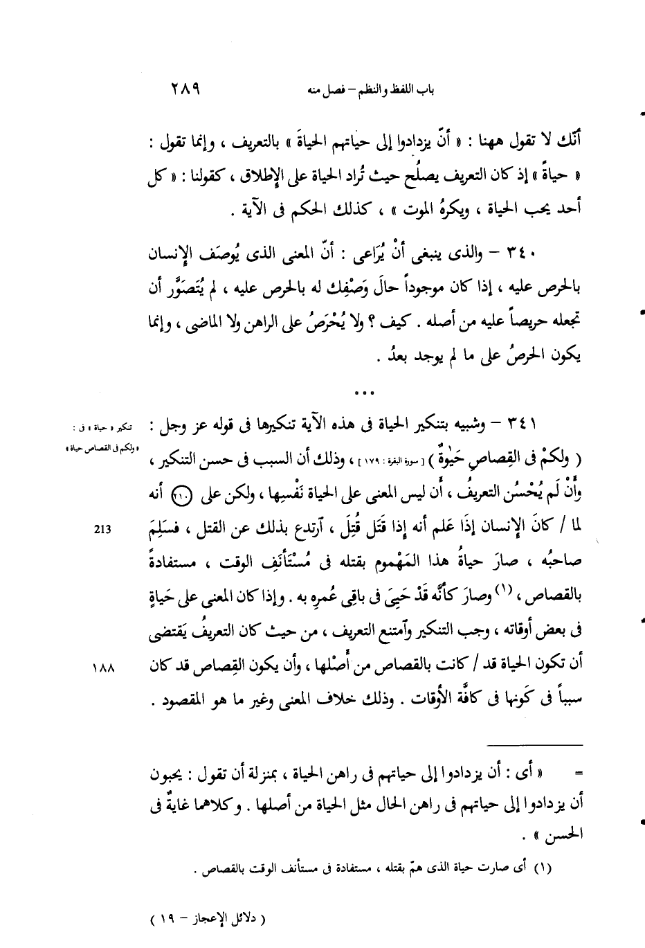 341 - وشبيهٌ بتنكير الحياةِ في هذه الآية تنكيرُها في قوله عز وجل: [البقرة: 179]، وذلكَ أنَّ السببَ في حُسنِ التنكيرِ، وأنْ لم يَحْسُن التعريفُ، أنْ ليسَ المعنى على الحياةِ نفسِها، ولكنْ على أنه لمَّا كانَ الإنسانُ إِذا عَلمَ أنه إِذا قتلَ قُتِل، ارتدعَ بذلك عن القتل، فسلم صاحبُه، صار حياةُ هذا المَهْمومِ بقتلِه في مستأنفِ الوقتِ، مستفادَةً بالقِصَاصِ1، وصارَ كأنَّه قد حَييَ في باقي عمره به. وإِذا كان المعنى على حياةٍ في بعضِ أوقاتِه، وجَبَ التنكيرُ وامتنعَ التعريفُ، من حيثُ كان التعريفُ يَقْتضي أن تكونَ الحياةُ قد كانَتْ بالقِصاص من أصْلها، وأن يكونَ القِصاص قد كان سبباً في كونِها في كافَّة الأوقاتِ. وذلك خلافُ المعنى وغيرُ ما هو المقصود.