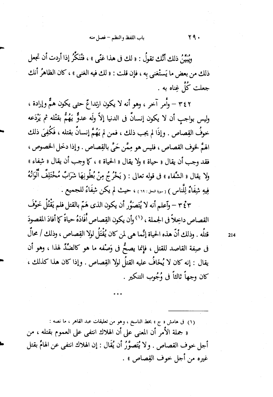 342 - وأمرٌ آخرُ، وهو أنه لا يكون ارتداعٌ حتى يكونَ همٌّ وإرادةٌ وليس بواجبٍ أن لا يكونَ إنسانٌ في الدنيا إلاَّ وله عَدوٌّ يَهمُّ بقتله ثم يردَعُه خوفُ القِصاصِ. وإِذا لم يَجِبْ ذلك، فمَن لم يَهُمَّ إِنسانٌ بقتلِه، فكُفيَ ذلك الهَمَّ لخوفِ القصاصِ، فليس هو ممَّن حَيِيَ بالقصاص. وإِذا دخَلَ الخصوصُ، فقد وَجَبَ أن يقالَ "حياةٌ" ولا يقالَ "الحياةُ"، كما وَجَبَ أن يقالَ "شفاءٌ" ولا يقالُ "الشفاءُ" في قولِه تعالى: {يَخْرُجُ مِنْ بُطُونِهَا شَرَابٌ مُخْتَلِفٌ أَلْوَانُهُ فِيهِ شِفَاءٌ لِلنَّاسِ} [النحل: 69]، حيثُ لم يكن شفاءٌ للجميع.