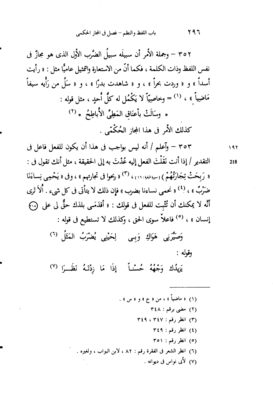 353 - واعلمْ أنه ليس بواجبٍ في هذا أن يكونَ للفعل فاعلٌ في التقدير إذا أنتَ نَقَلْتَ الفعلَ إليه عدْتَ به إلى الحقيقة، مثلَ أنَّكَ تقول في: {رَبِحَتْ تِجَارَتُهُمْ} [البقرة: 16] 3 "ربحوا في تجارتهم"، وفي "يحمي نسائنا ضَرْبٌ"4، "نَحمي نساءنا بضرب" فإِنَّ ذلك لا يتأتَّى في كلِّ شيءٍ. ألا تَرَى أنه لا يُمكِنُكَ أن تُثْبِتَ للفعل في قولك: "أقدَمني بلدَك حقٌّ لي على إنسان"5، فاعلاً سوى الحقِّ، وكذلك لا تستطيعُ في قولهِ: