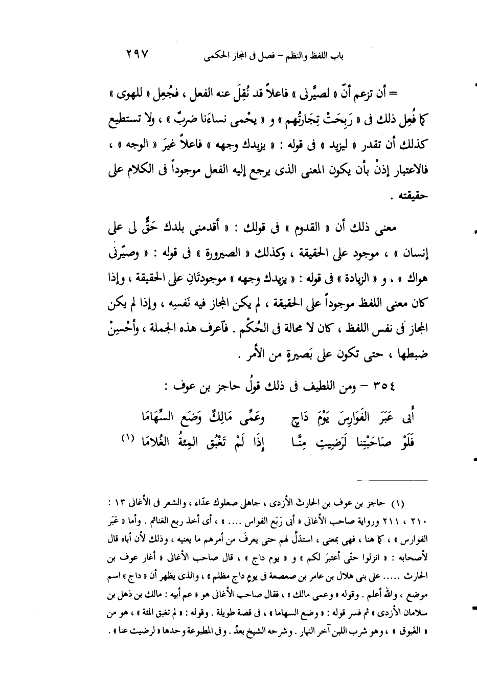 معنى ذلك أن "القدوم" في قولك: "أقدمي بلدَك حقٌّ لي على إنسان"، موجودٌ على الحقيقة، وكذلك "الصيرورةُ" في قوله: "وصيَّرني هواك"، و "الزيادة" في قوله: "يزيدُك وجهُه" موجودتان على الحقيقة، وإذا كان معنى اللفظِ موجوداً على الحقيقةِ، لم يكُنِ المجازُ فيه نَفْسَه، وإِذا لم يكنِ المجازُ في نفسِ اللفظِ، كان لا مَحالة في الحُكْم. فاعرفْ هذه الجملةَ، وأَحْسِنْ ضبْطَها، حتى تكونَ على بصيرةٍ من الأمر.