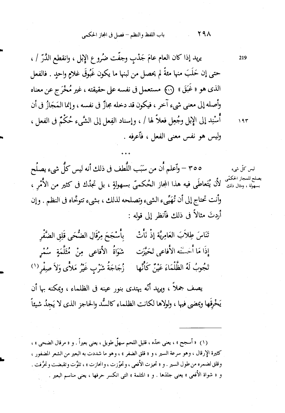 355 - واعلمْ أنَّ مِن سبَب اللطفِ في ذلك أنَّه ليس كلُّ شيء يَصْلُح لأن يُتعاطى فيه هذا المجازُ الحُكْمي بسهولةٍ، بل تَجدُك في كثيرٍ من الأمر، وأنتَ تحتاجُ إلى أن تُهيِّئَ الشيءَ وتصلِحَه لذلك، بشيءٍ تتوخاه في النظْم. وإنْ أرَدْت مثالاً في ذلك فانظْر إلى قوله: