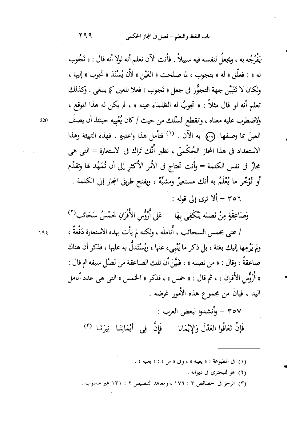 يفرجه به، ويجعل لنفسه فيه سبيلًا. فأت الآن تعلم أن لولا أنه قال: "تجوبُ له": فعلَّق "له الحبوب، لَمَا صلحَتْ "العَينُ" لأن يُسْنَد "تجوب" إليها، ولكان لا تَتَبَيَّنُ جهةَ التجوُّز في جعْل "تجوب" فعَلاً للعين كما ينبغي. وكذلك تَعْلم أنه لو قال مثلاً: "تجوبُ له الظلماءَ عينُه"، لم يكنْ له هذا الموقعُ، ولاضطْرَبَ عليه معناهُ، وانقَطَع السِّلْكُ من حيثُ كان يَعيبه حينئذٍ أن يَصِفَ العينَ بما وصفَها به الآنَ1 فتأملْ هذا واعتَبِرْهُ. فهذه التهيئةُ وهذا الاستعدادُ في هذا المجاز الحُكْمي، نظيرُ أنك تَراك في الاستعارةِ التي هي مجازٌ في نفسِ الكلمةِ وأنتَ تحتاجُ في الأمر الأكثرِ إلى أنْ تُمهِّد لها وتُقدِّم أو تؤخِّر ما يُعْلَمُ به أَنكَ مستعيرٌ ومُشبِّهٌ، ويُفتَحُ طريقُ المجاز إلى الكلمة.