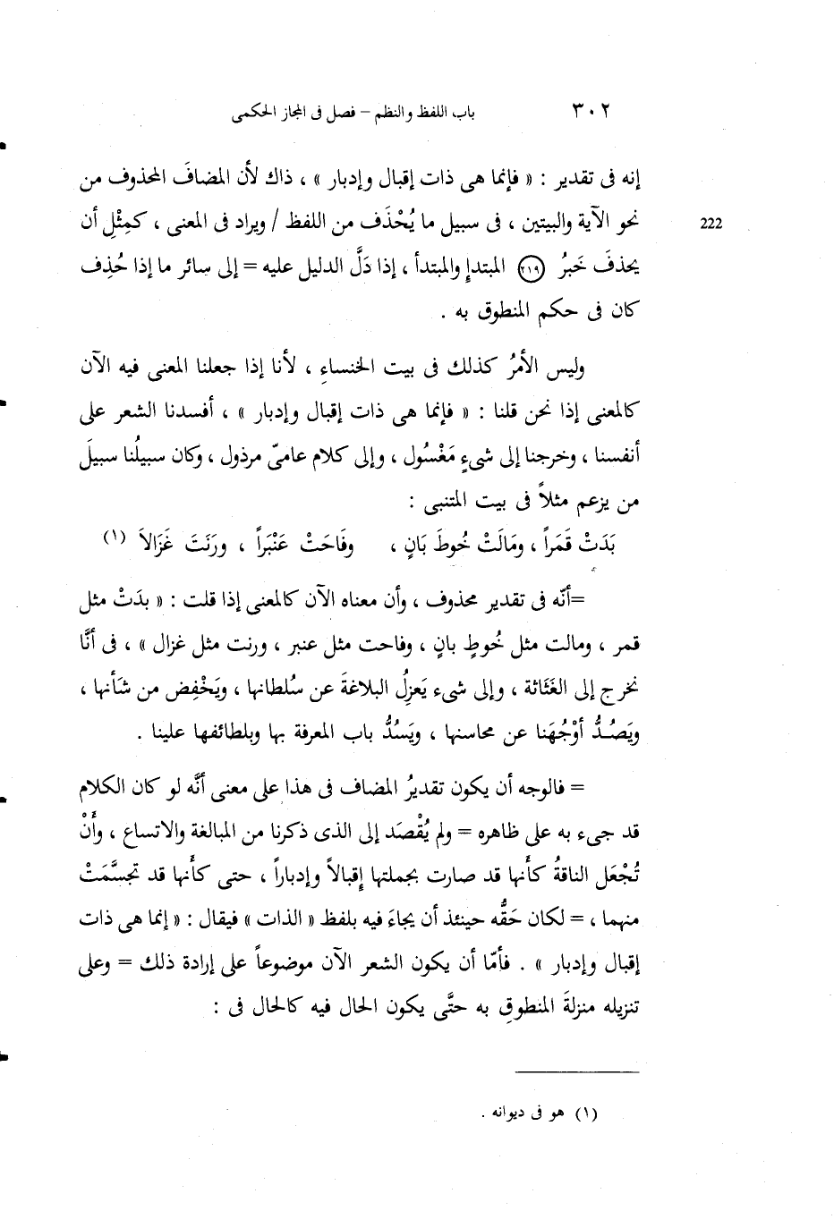 فالوجْهُ أن يكون تقديرُ المضافِ في هذا على المعنى أنه لو كان الكلامُ قد جيءَ بهِ على ظاهرهِ ولم يُقْصدْ إلى الذي ذكرنا من المبالغة والاتِّساع، وأنْ تُجْعَلَ الناقةُ كأَنها قد صارتْ بجملتها إقبالاً وإدباراً، حتى كأَنها قد تجسَّمَتْ منهما، لَكانَ حقُّه حينئذٍ أن يُجاء فيه بلفظِ "الذاتِ" فيُقال: "إنما هي ذاتُ إقبالٍ وإدبارٍ". فأَمَّا أن يكونَ الشعرُ الآن موضوعاً على إرادةِ ذلك وعلى تنزيلهِ منزلةَ المنطوقِ به حتى يكونَ الحالُ فيه كالحال في: