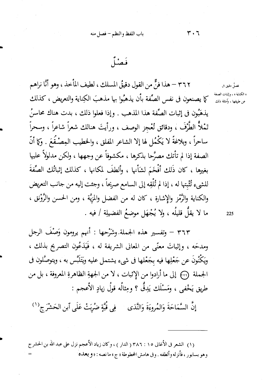 362 - هذا فنٌّ من القول دقيق المسلك، لطيفُ المأخذ، وهو أَنَّا نراهم كما يصنعون في نفسِ الصفة بأن يذهبوا بها مذهب الكنايةِ والتعريضِ، كذلك يذهبون في إِثباتِ الصفة هذا المذهبَ. وإذا فعلوا ذلك، بدتْ هناك محاسنُ تملأ الطرْفَ. وَدقائقُ تُعجزُ الوصفَ، ورأيتَ هنالك شعراً شاعراً، وسحْراً ساحراً، وبلاغةً لا يكمل لها إلا الشاعرُ المُفْلِق، والخطيبُ المِصْقَع. وكما أنَّ الصفةَ إذا لم تأتِكَ مُصرَّحاً بذِكْرها، مكشوفاً عن وجهها، ولكن مدلولاً عليها بغيرها، كان ذلك أفخمَ لشأنها، وألطفَ لمكانِها، وكذلك إثباتك الصفة للشيء ثبتها له، إِذا لم تُلْقِه إلى السامع صريحاً، وجئتَ إليه من جانبِ التعريضِ والكنايةِ والرمزِ والإِشارة، كان له من الفضلَ والمزيَّة، ومن الحسْن والرونق، ما لا يقلُّ قليلُه، ولا يُجْهَلُ موضِعُ الفضيلةِ فيه.