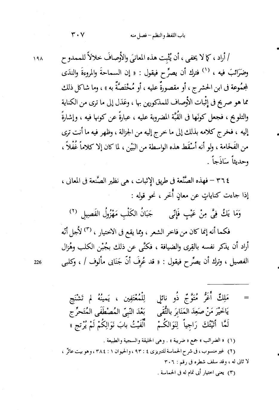 فكما أَنَّه إِنَّما كان مِنْ فاخرِ الشِّعر، وممَّا يقَعُ في الاختيار3، لأجل أنه أَرادَ أنْ يذْكُرَ نفسَه بالقرى والضيافةِ، فكنَّى عن ذلك بجُبْنِ الكَلْب وهُزالِ الفصيلِ، وتَرَكَ أن يُصرِّحَ فيقولَ: "قد عُرِفَ أنَّ جَنابِي مألوف، وكلبي