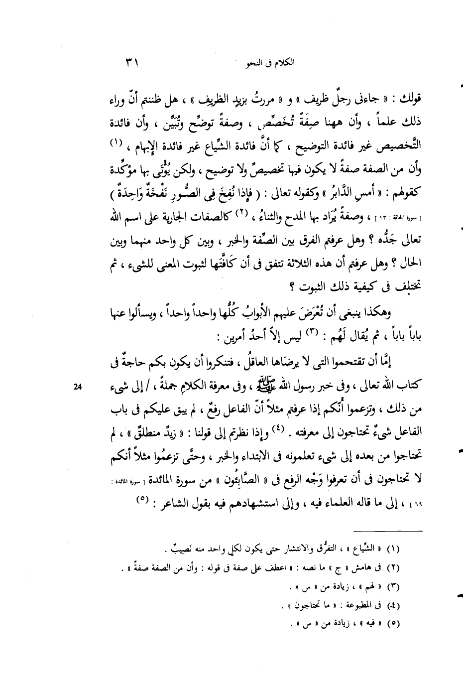 قولك: "جاءني رجل ظريف" و "مررت بزيدٍ الظريفِ"، هل ظَننتُم أنَّ وراءَ ذلك علمًا، وأن ههنا صِفةً تُخصِّص، وصفةً تُوضح وتُبين، وأن فائدةَ التخصيص غيرُ فائدةِ التَّوضيح، كما أن فائدةَ الشِّياع غيرُ فائّدةِ الإِبهام1، وأنَّ مِنَ الصفةِ صفة لا يكون يها تخصيص ولا توضيح، ولكن يوتي بها مؤكَّدةً كقولهم: "أَمسِ الدابرُ" وكقوله تعالى: {فَإِذَا نُفِخَ فِي الصُّورِ نَفْخَةٌ وَاحِدَة} [سورة الحاقة: 13]، وصفةً يُراد بها المدحُ والثناءُ2، كالصفاتِ الجاريةِ على اسْم الله تعالى جَدَّه؟ وهل عَرَفتم الفَرْقَ بينَ الصفة والخبر، وبينَ كلِّ واحدٍ منهما وبينَ الحال، وهل عرَفْتم أَنَّ هذه الثلاثةَ تَتَّفْقُ في أنَّ كافَّتَها لثُبوتِ المعنى لِلشيء، ثم تَخْتلفٌ في كيفيّةِ ذلك الثبوتِ؟