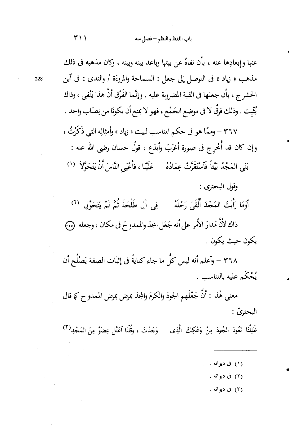 367 - ومما هو حُكْم المناسِب لبيتِ "زيادٍ" وأمثالهِ التي ذكَرْتُ، وإنْ كانَ قد أُخْرِجَ في صورةٍ أغربَ وأبدع، قول حسان رضي الله عنه: