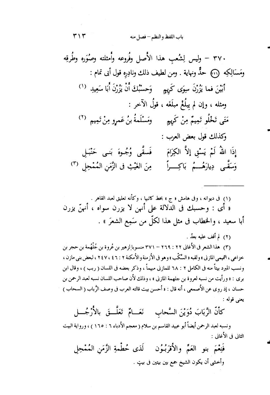 370 - وليس لِشُعَبِ هذا الأصْلِ وفروعِه وأمثلتِه وصُورهِ وطُرُقِهِ ومسالِكِه حدٌّ ونهايةٌ. ومن لطيفِ ذلك ونادره قول أبي تمام: