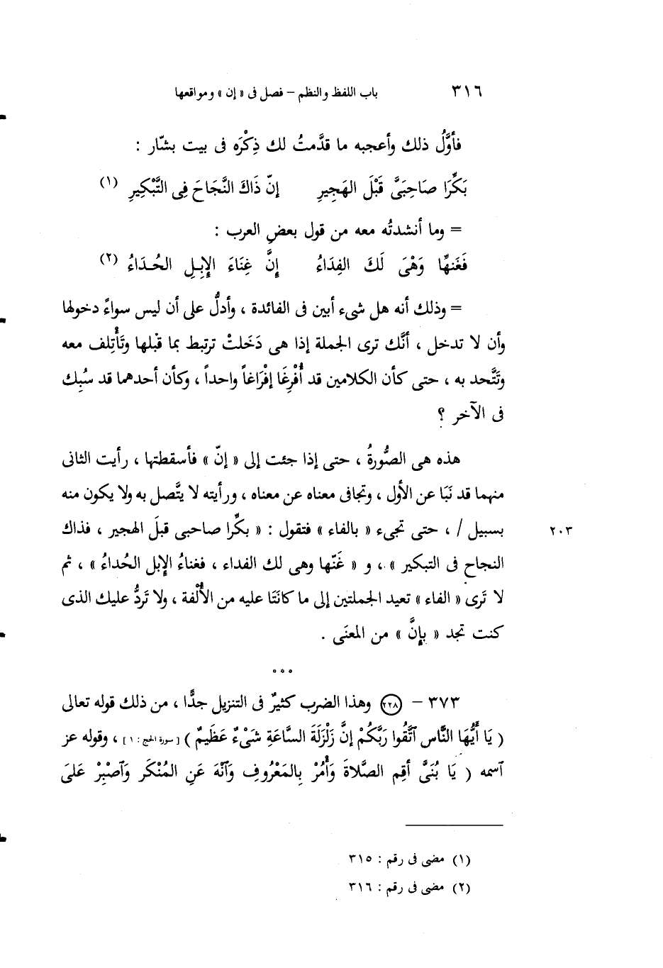 373 - وهذا الضربُ كثيرٌ في التَّنزيلِ جدَّاً، من ذلك قولُه تعالى: {يَا أَيُّهَا النَّاسُ اتَّقُوا رَبَّكُمْ إِنَّ زَلْزَلَةَ السَّاعَةِ شَيْءٌ عَظِيمٌ} [الحج: 1]، وقولُه عزَّ اسمُه {يَا بُنَيَّ أَقِمِ الصَّلاةَ وَأْمُرْ بِالْمَعْرُوفِ وَانْهَ عَنِ الْمُنْكَرِ وَاصْبِرْ عَلَى