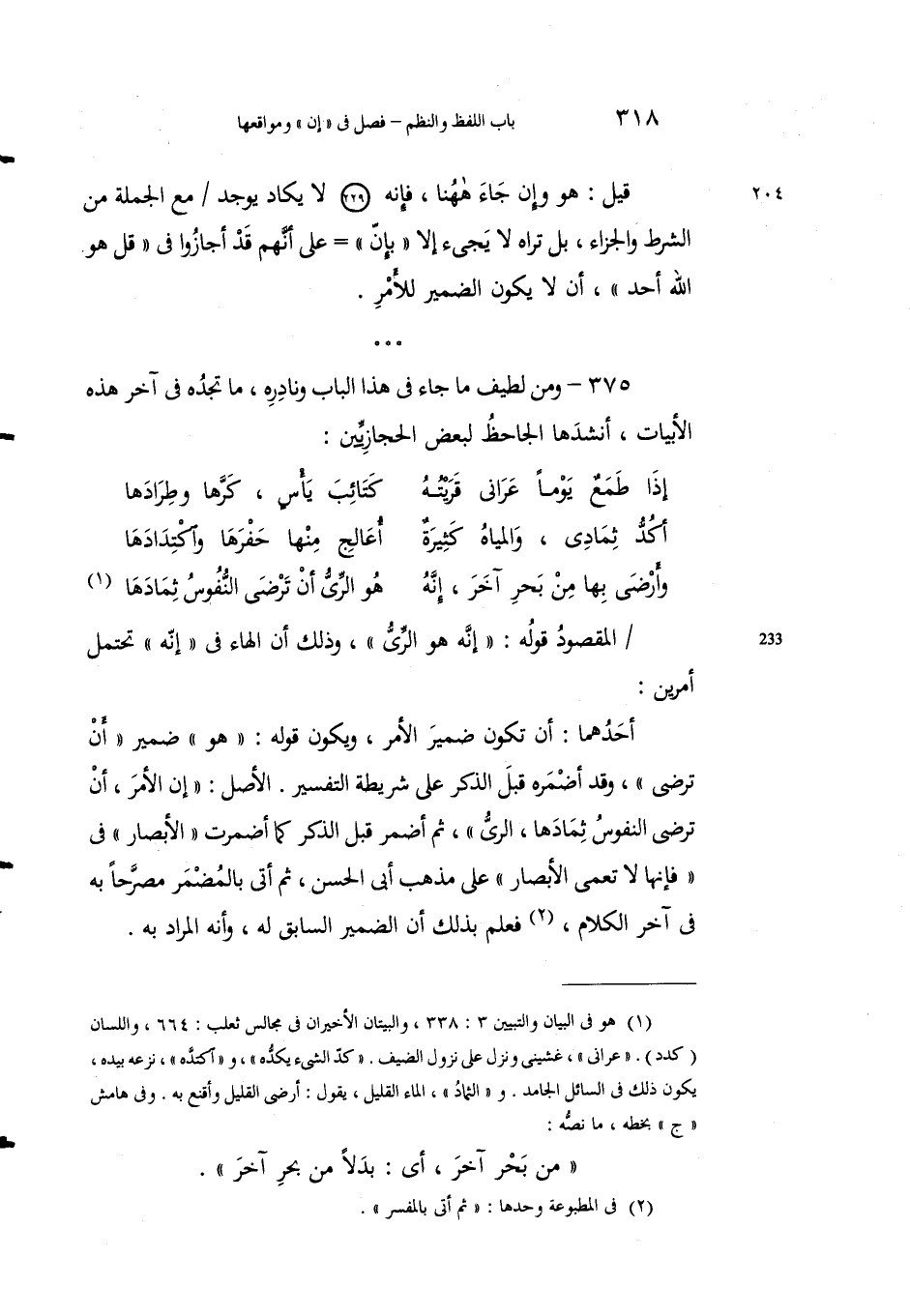 أحدُهما: أن تكونَ ضميرَ الأَمْرِ، ويكونَ قولُه: "هو" ضمير: "أن ترضى"، وقد أضمره قبل الذكْر على شريطةِ التفسير. الأصل: "إنَّ الأمرَ، أن ترضى النفوسُ ثِمادَها، الرِّيُّ"، ثم أُضمِر قبل الذكْرِ كما أُضمرِت "الأبصارُ" في "فإنها لا تَعْمَى الأبصار" على مذهب أبي الحسنِ، ثم أتى بالمضْمَرِ مصرَّحاً به في آخر الكلام2، فعُلِمَ بذلك أن الضميرَ السابقَ له، وأنَّه المراد به.