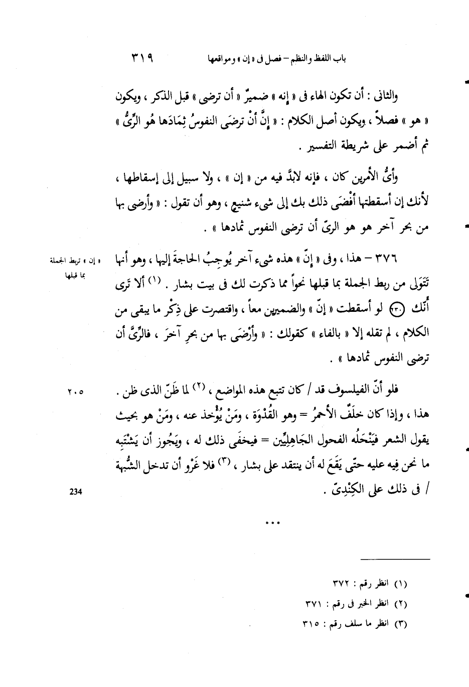 376 - هذا، وفي "إنَّ" هذه شيءٌ آخرُ يُوجِبُ الحاجةَ إليها، وهو أَنها تَتولَّى من رَبْط الجملةِ بما قبْلَها نحواً مما ذكرتُ لك في بيتِ بشارٍ1. ألا ترى أَنك لو أَسقطْتَ "إنَّ" والضميرَيْنِ معاً، واقتصَرْتَ على ذكرِ ما يَبْقى من الكلامِ، لم تَقلْهُ إلا "بالفاء" كقولك: "وأرضَى بها من بحرِ آخرَ، فالريُّ أن ترضَى النفوسُ ثِمادها".