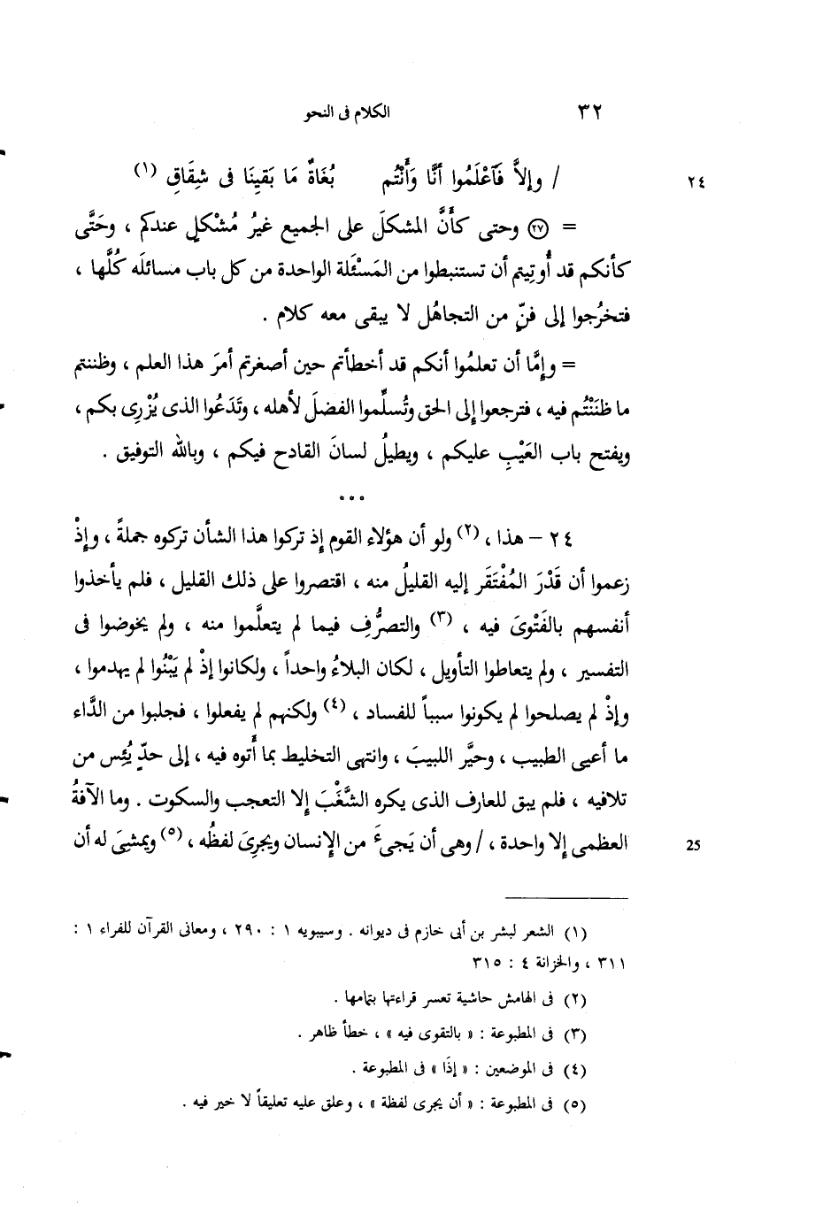 24 - هذا2، ولو أنَّ هؤلاءِ القومَ إذْ تَرَكوا هذا الشأْنَ تركوهُ جُملة، وإذْ زَعَموا أنَّ قَدْرَ المْفْتَقَر إلِيه القليلُ منه، اقْتَصروا على ذلك القليل، فلم يأخذوا أنفسهم بالفتوى فيه3، والتصرُّف فيما لم يتعلموا منه، ولم يَخُوضوا في التفسير، ولم يتعاطَوْا التأويلَ، لكانَ البلاءُ واحداً، ولكانوا إذْ لم يَبْنوا لم يَهْدِموا، وإذْ لم يصْلِحوا لمْ يَكونوا سَبباً للفَسادِ،4 ولكنهم لم يَفْعَلُوا، فجَلبُوا مِن الدّاءِ ما أَعيى الطبيبَ، وحَيَّر اللبيبَ، وانتهى التخليطُ بما أَتَوْه فيه، إلى حدٍّ يُئسَ مِن تَلافيه، فلم يَبْق للعارفِ الذي يَكْره الشَّغَب إلاَّ التعجبُ والسكوتُ. وما الآفةُ العُظمى إلاَّ واحدةٌ، وهي أن يجيءَ منَ الإنسان ويجري لفظه5، ويمشي له أن
