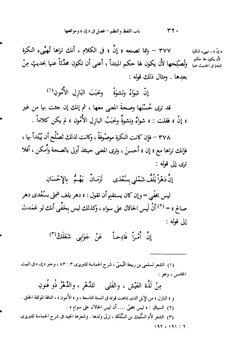 377 - ومما تَصنعُه "إنَّ" في الكلام، أنَّك تَراها تهيئ النكِرةَ وتُصْلِحُها لأن يكونَ لها حكْمُ المبتدأ، أعنى أن تكونَ محدَّثاً عنها بحديثٍ من بعدها. ومثال ذلك قوله: