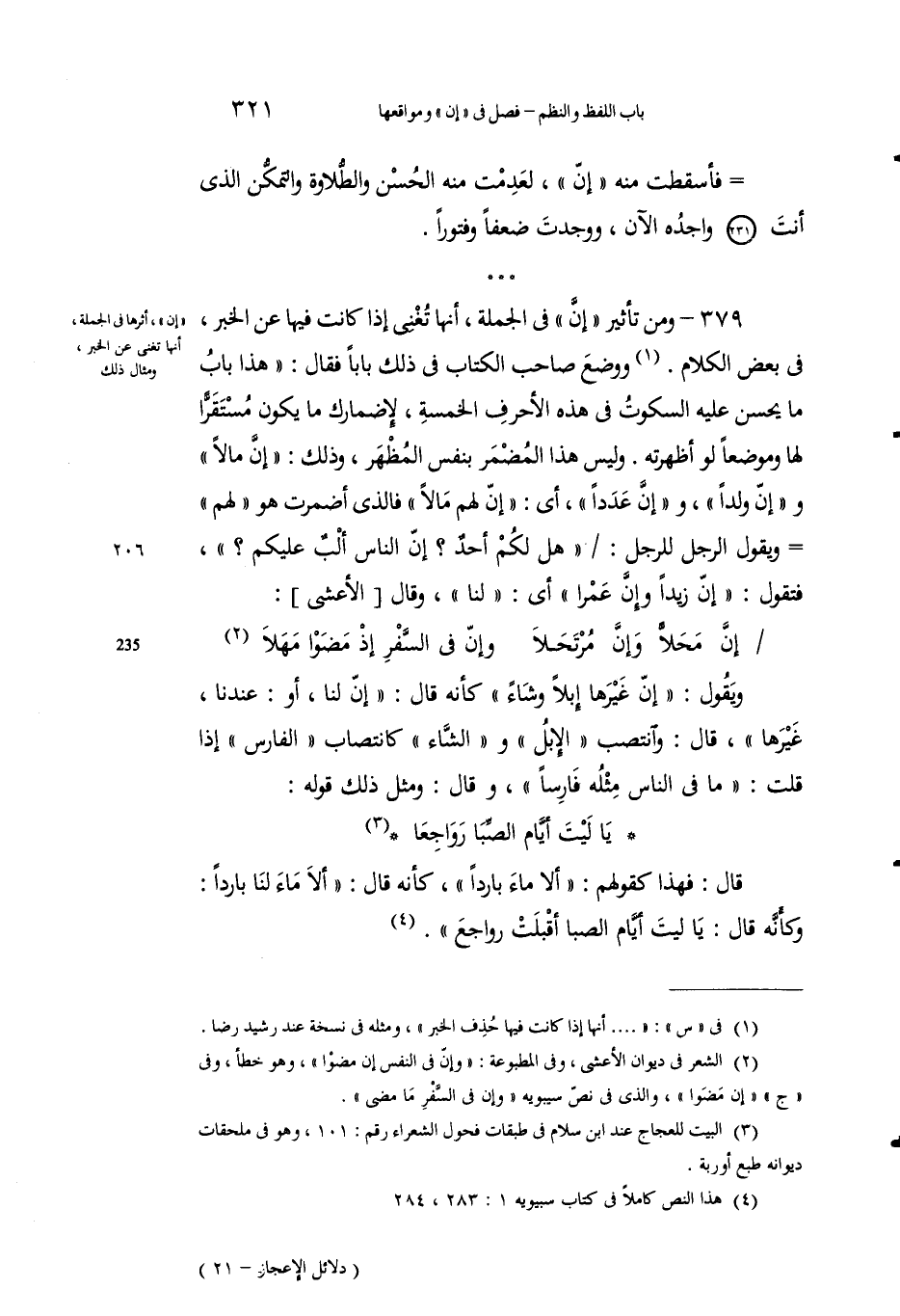 379 - ومن تأثير "إن" في الجملة، أنها ت غني إذا كانتْ فيها عن الخَبر، في بعضِ الكلامِ1. ووَضَعَ صاحبُ الكتاب في ذلك باباً فقال: "هذا بابُ ما يَحْسُنُ عليه السكوتُ في هذه الأحرُفِ الخمسةِ، لإضمارِكَ ما يكونُ مستقرًّا لها وموضعًا لو أظهرته. وليس هذا المضمطر بنفس المظهر، وذلك: "إن مالًا" و "إن ولدًا"، و "إن عدداً"، أي: "إنَّ لَهُمْ مالاً" فالذي أضمرتَ هو "لهم" ويقولُ الرجلُ للرَّجل: "هلْ لكُم أحدٌ؟ إنَّ الناسَ أَلْبٌ عليكمْ"، فَيَقول: "إنَّ زيداً وإِنَّ عَمراً" أَي: "لنا"، وقال [الأعشى]: