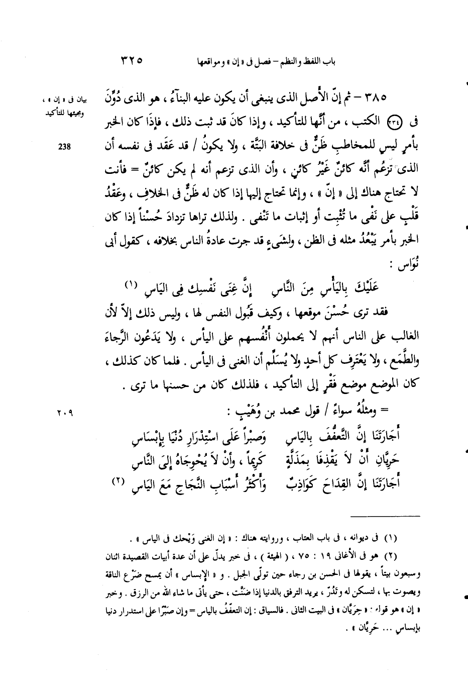 2 هو في الأغاني 19: 75، "الهيئة"، في خبر يدل على أن عدة أبيات القصيدة اثنان وسبعون بيتًا، يقولها في الحسن بن رجاء حين تولى الجبل. و "الإبساس" أن يمسح ضرع الناقة وصوت بها، لتسكن له وتذر، يريد الترفق بالدنيا إذا ضنت، حتى يأتي ما شاء الله من الرزق. وخبر "إن" هو قوا "حريان" في البيت الثاني. فالسياق: إن التعفف باليأس وإن صبرا على استدرار دنيا بإساس ... حريان".