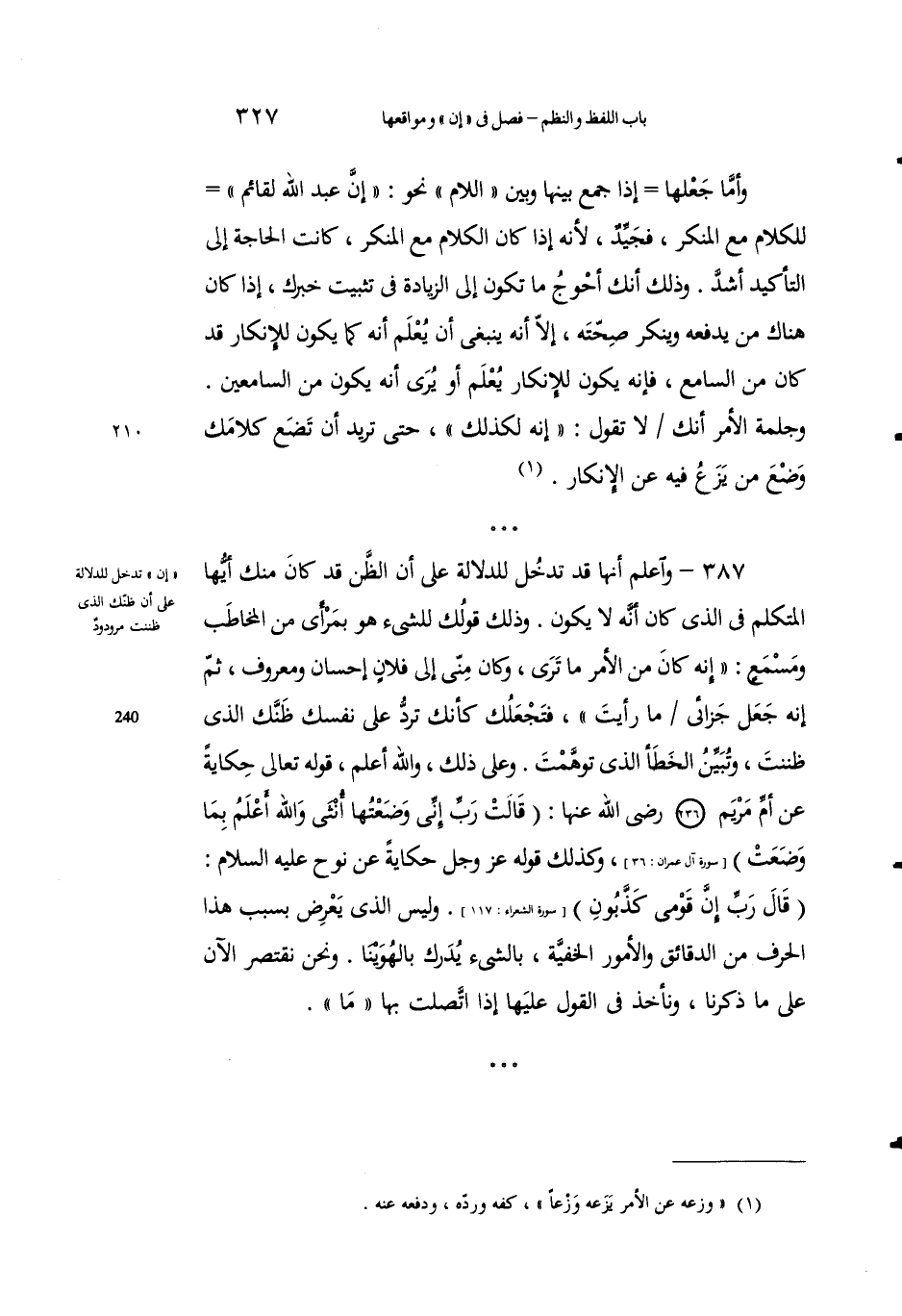 387 - واعْلَمْ أنها قد تَدْخلُ للدلالة على أنَّ الظنَّ قد كان منكَ أيُّها المتكلِّمُ في الذي كان أنَّه لا يكونُ. وذلك قولُكَ لِلشيءِ هو بمرأى من المُخاطَبِ ومَسْمع: "إنه كان من الأمْر ما تَرى، وكان منِّي إلى فلانٍ إحسانٌ ومعروفٌ، ثم إنه جَعلً جَزائي ما رأيْت"، فتجعلُكَ كأنك تَردُّ على نفْسِك ظَنَّكَ الذي ظنَنْتَ، وتُبيِّنُ الخطأ الذي توهَّمْتَ. وعلى ذلك، واللهُ أعلمُ، قولُه تعالى حكايةً عن أمِّ مريم رضي الله عنهما: {قَالَتْ رَبِّ إِنِّي وَضَعْتُهَا أُنْثَى والله أَعْلَمُ بِمَا وَضَعَتْ} [آل عمران: 36]، وكذلك قولُه عزَّ وجَلَّ حكايةً عن نوحٍ عليه السلام: {قَالَ رَبِّ إِنَّ قَوْمِي كَذَّبُون} [الشعراء: 117]، وليس الذي يَعْرِضُ بسببِ هذا الحرفِ من الدقائق والأُمور الخفيَّةِ، بالشيء يُدْرَك بالهُوَينا. ونحن نَقْتصِر الآن على ما ذكَرْنا، ونأخذُ في القولِ عليها إذا اتصلتْ بها "ما".