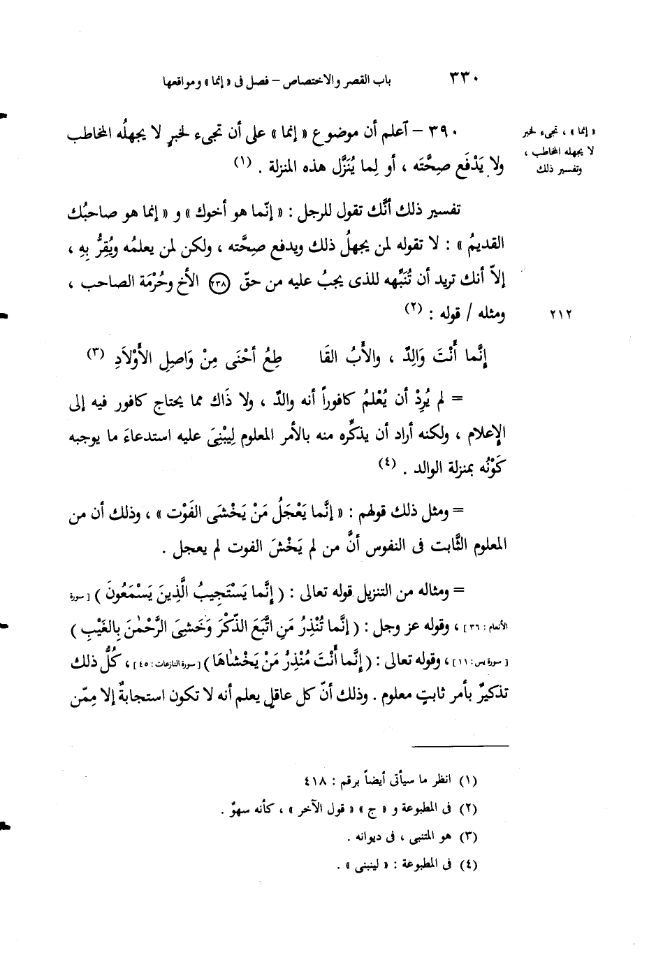 390 - إِعْلم أنَّ موضوعَ "إنما" على أن تجيءَ لخَبرٍ لا يَجهلُهُ المخاطَبُ ولا يَدفعُ صِحَّتَه، أو لا يُنزَّلُ هذه المنزلةَ1.