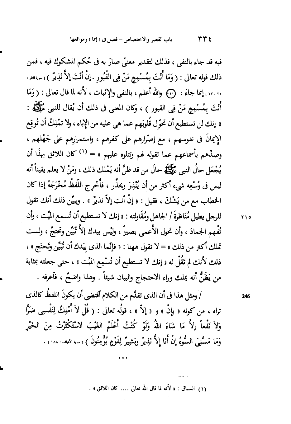فيه قد جاء بالنَّفي، فذلك لتقديرِ معنًى صارَ به في حُكْم المشكوكِ فيه، فمِنْ ذلك قولُه تعالى: {وَمَا أَنْتَ بِمُسْمِعٍ مَنْ فِي الْقُبُورِ، إِنْ أَنْتَ إِلَّا نَذِير} [فاطر: 22، 23] إنما جاء واللهُ أعلم، بالنفي والإِثبات، لأنه لمَّا قال تعالى: {وَمَا أَنْتَ بِمُسْمِعٍ مَنْ فِي الْقُبُور}، وكان المعنى في ذلك أن يقال للنبي صلى الله عليه وسلم "إنك لن تستطيعَ أن تُحوِّل قلوبَهُم عمَّا هي عليه من الإِباء، ولا تملِكُ أن تُوقِعَ الإيمانَ في نفوسِهم، مع إصرارِهم على كُفرهم، واستمرارِهم على جَهْلِهم، وصدِّهم بأسْماعِهم عما تقوله لهم وتتوله عليه"1 كان اللائقُ بهذا أن يُجعَل حالُ النبيِّ صلى الله عليه وسلم حالَ مَنْ قد ظَنَّ أنه يملكُ ذلكَ، ومَنْ لا يَعْلَمُ يقينًا أنه ليس ي وُسْعه شيءٌ أكثرُ من أن يُنْذِر ويُحَذِّر، فأخْرَجَ اللفظَ مُخْرَجَه إذا كان الخطابُ مع مَنْ يَشُكُّ، فقيل: "إِنْ أَنتَ إِلاَّ نَذِيرٌ". ويُبيِّنُ ذلك أنَّك تقولُ للرجل يُطِيلُ مُناظَرةَ الجاهلِ ومقاولَتَهُ: "إنَّك لا تَستطيعُ أنْ تُسْمِعَ الميِّتَ، وأنْ تُفْهِمَ الجمادَ، وأن تحوِّلَ الأعمى بصيرًا، وليس بيدك إيلا تُبَيِّنَ وتحتجَّ، ولستَ تملكُ أكثرَ من ذلك" لا تقول ههنا: "فإنَّما الذي بيدِك أنْ تُبَيِّنَ وتحتجَّ"، ذلك لأنك لم تَقُلْ له "إنك لا تستطيع أنْ تُسْمِعَ الميتَ"، حتى جعلته بماثبة مَنْ يَظُنُّ أنه يملك وراءَ الاحتجاجِ والبيانِ شيئاً. وهذا واضحٌ، فاعرفْه.