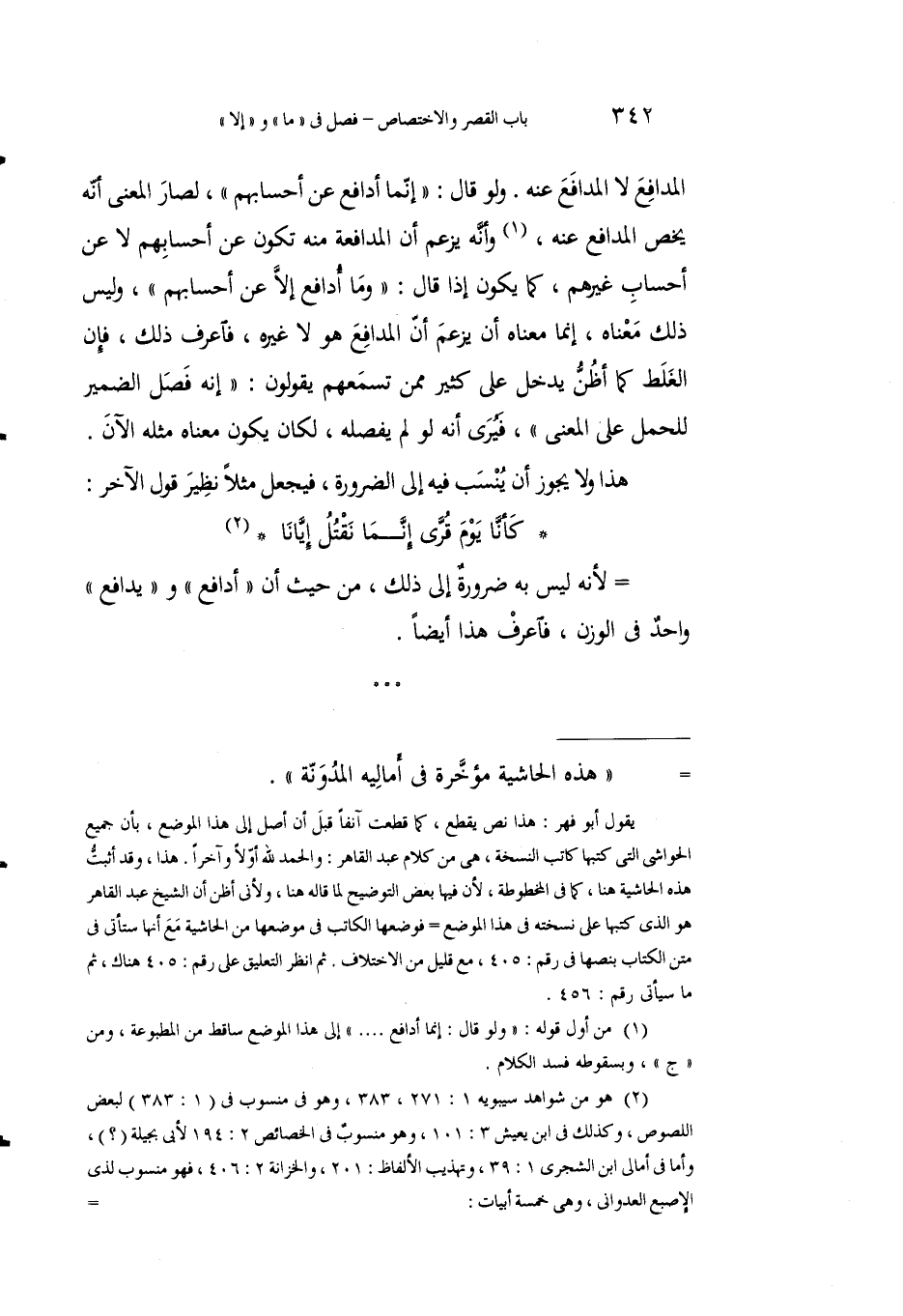 يقول أبو فهر: هذا نص يقطع، كما قطعت آنفًا قبل أن أصل إلى هذا الموضع، بأن جميع الحواشي التي كتبها كانت النسخة، وهي من كلام عبد القاهر: والحمد لله أولًا وآخرًا. هذا، وقد أثبت هذه الحاشية هنا، كما في المخطوطة، لأن فيها بعض التوضيح لما قاله هنا، ولأني أظن أن الشيخ عبد القاهر هو الذي كتبها على نسخته في هذا الموضع فوضعها الكاتب في موضعها من الحاشية مع أنها ستأتي في متن الكاب بنصها في رقم: 405، مع قليل من الاختلاف. ثم انظر التعليق على رقم: 405 هناك، ثم ما سيأتي رقم: 456.