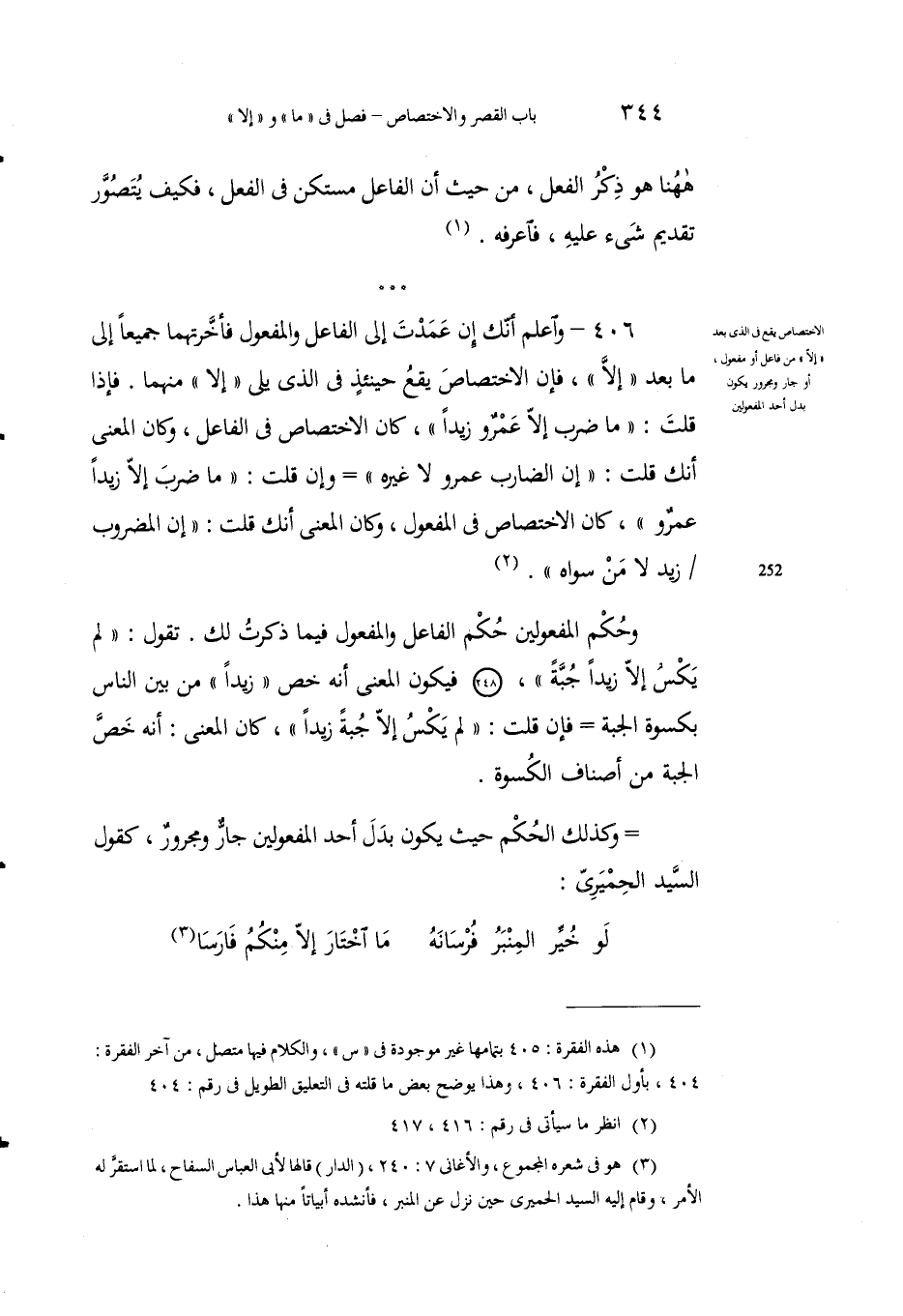 406 - واعلمْ أَنك إنْ عمَدْت إِلى الفاعلِ والمفعولِ فأخَّرْتَهما جميعاً إلى ما بَعْد "إلاَّ"، فإنَّ الاختصاصَ يقَعُ حينئذٍ في الذي يلي "إِلاّ" منهما. فإذا قلتَ: "ما ضرَبَ إلاَّ عمرو زيداً"، كان الاختصاصُ في الفاعلِ، وكان المعنى أنك قلت: "إنَّ الضاربَ عمرو لا غيرُه" وإِن قلْتَ: "ما ضربَ إِلا زيداً عمرو"، كان الاختصاصُ في المفعول، وكان المعنى أنك قلتَ: "إِنَّ المضروبَ زيدٌ لا مَنْ سِواه"2