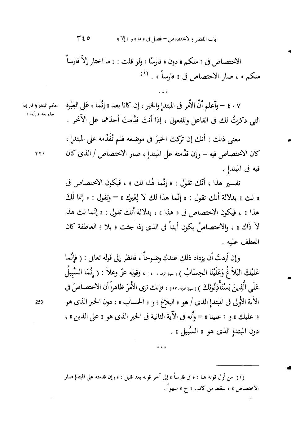 407 - واعلمْ أَنَّ الأمرَ في المبتدأ والخَبر، إنْ كانا بَعْدَ "إِنّما" عَلَى العبرةِ التي ذكرتُ لك فيالفاعل والمفعولِ، إِذا أنتَ قدَّمْتَ أَحدَهما على الآخَرِ.