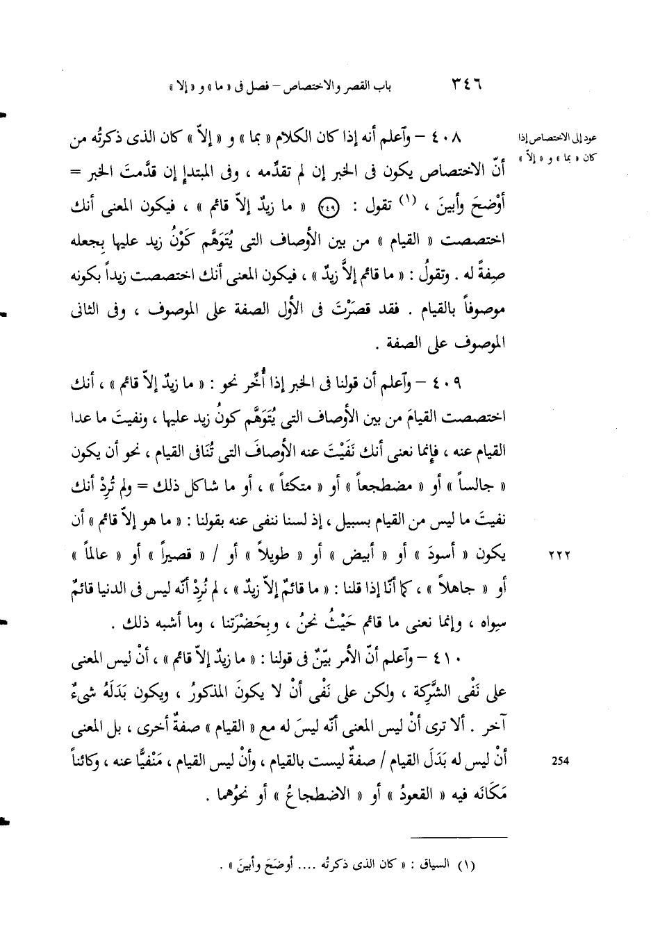 409 - واعلمْ أَنَّ قولَنا في الخبرِ إذا أُخِّر نحو: "ما زيدٌ إلاَّ قائم"، أَنك اختصصْتَ القيامَ من بينِ الأوصافِ التي يُتوهَّم كونُ زيدٍ عليها، ونفَيْتَ ما عدا القيامَ عنه، فإنما تعني أنك نفَيْتَ عنه الأوصافَ التي تُنَافي القيامَ، نحو أنْ يكونَ "جالساً" أو "مضطجعاً" أو "متكئًا" أو ما شاكل ذلك ولم ترد أنك نفَيْتَ ما ليس مِنَ القيامِ بسبيلٍ، إذا لسنا نَنْفي عنه بقَوْلِنا: "ما هوَ إِلاّ قائم" أن يكونَ "أسودَ" أو "أبيضَ" أو طويلاً" أو "قصيراً" أو "عالِماً" أو "جاهِلاً"، كما أنا إأذا قلنا: "ما قائم إلا زيد"، لم يرد أنه ليس في الدنيا قائمٌ سِواهُ، وإِنَّما نَعْني ما قائمٌ حيثُ نحن، وَبِحَضْرَتِنا، وما أشبه ذلك.
