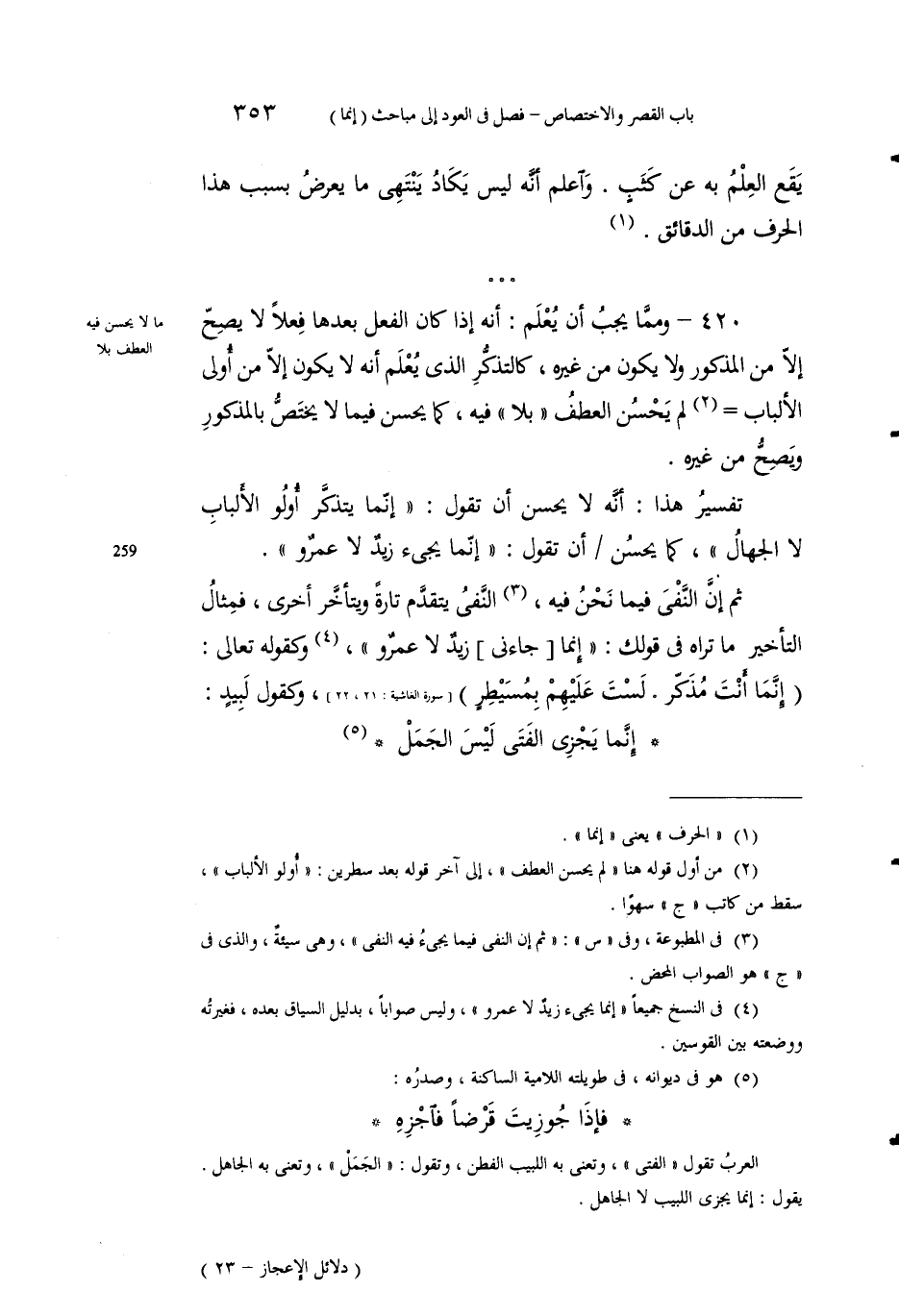 420 - ومما يَجبُ أن يُعْلَم: أنه إِذا كانَ الفعلُ بَعْدها فعلاً لا يصِحُّ إلاَّ مِن المذكورِ ولا يكونُ مِنْ غيرِه، كالتذكُّر الذي يُعْلَم أنه لا يكونُ إِلاّ مِن أُولي الألبابِ2 لم يحسُنِ العطفُ "بلا" فيه، كما يَحْسنُ فيما لا يُختصُّ بالمذكور وتصح مِن غَيره.