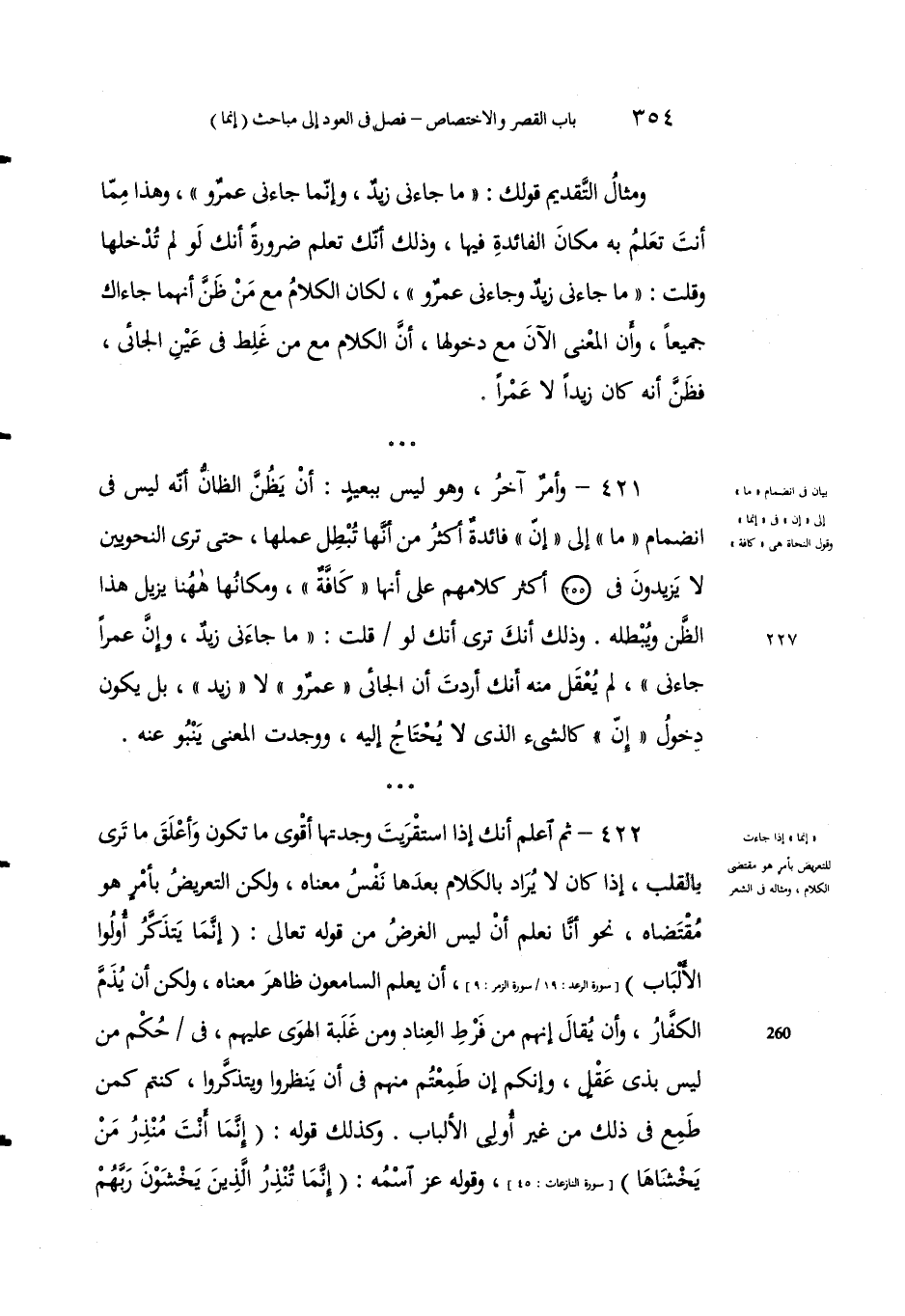 422 - ثم اعلمْ أَنك إِذا استقريْتَ وجدْتَها أقوى ما تكونُ وأعْلَقَ ما ترى بالقلب، إِذا كان لا يُراد بالكلامِ بعدَها نفْسُ معناه، ولكنَّ التعريضَ بأمرٍ هو مُقْتضاه، نحوُ أنَّا نعلمُ أَنْ ليس الغَرضُ مِن قولِه تعالى: {إِنَّمَا يَتَذَكَّرُ أُولُو الْأَلْبَابِ} [الرعد: 19] [الزمر: 9]، أنْ يَعلَم السَّامِعُون ظاهرَ معناه، ولكنْ أن يُذَمَّ الكفَّارُ، وأنْ يُقالَ إِنهم مِنْ فرطِ العِنادِ ومِنْ غلبةِ الهوى عليهم، في حُكْم مَنْ ليس بذي عقْلٍ، وإِنكم إنْ طمِعْتُم منهم في أنْ يَنْظروا ويَتذكَّروا، كنتُم كمَنْ طمِعَ في ذلك مِنْ غيرِ أُولي الألباب. وكذلك قولُه: {إِنَّمَا أَنْتَ مُنْذِرُ مَنْ يَخْشَاهَا} [النازعات: 45]، وقولُه عَزَّ اسْمُه: {إِنَّمَا تُنْذِرُ الَّذِينَ يَخْشَوْنَ رَبَّهُمْ