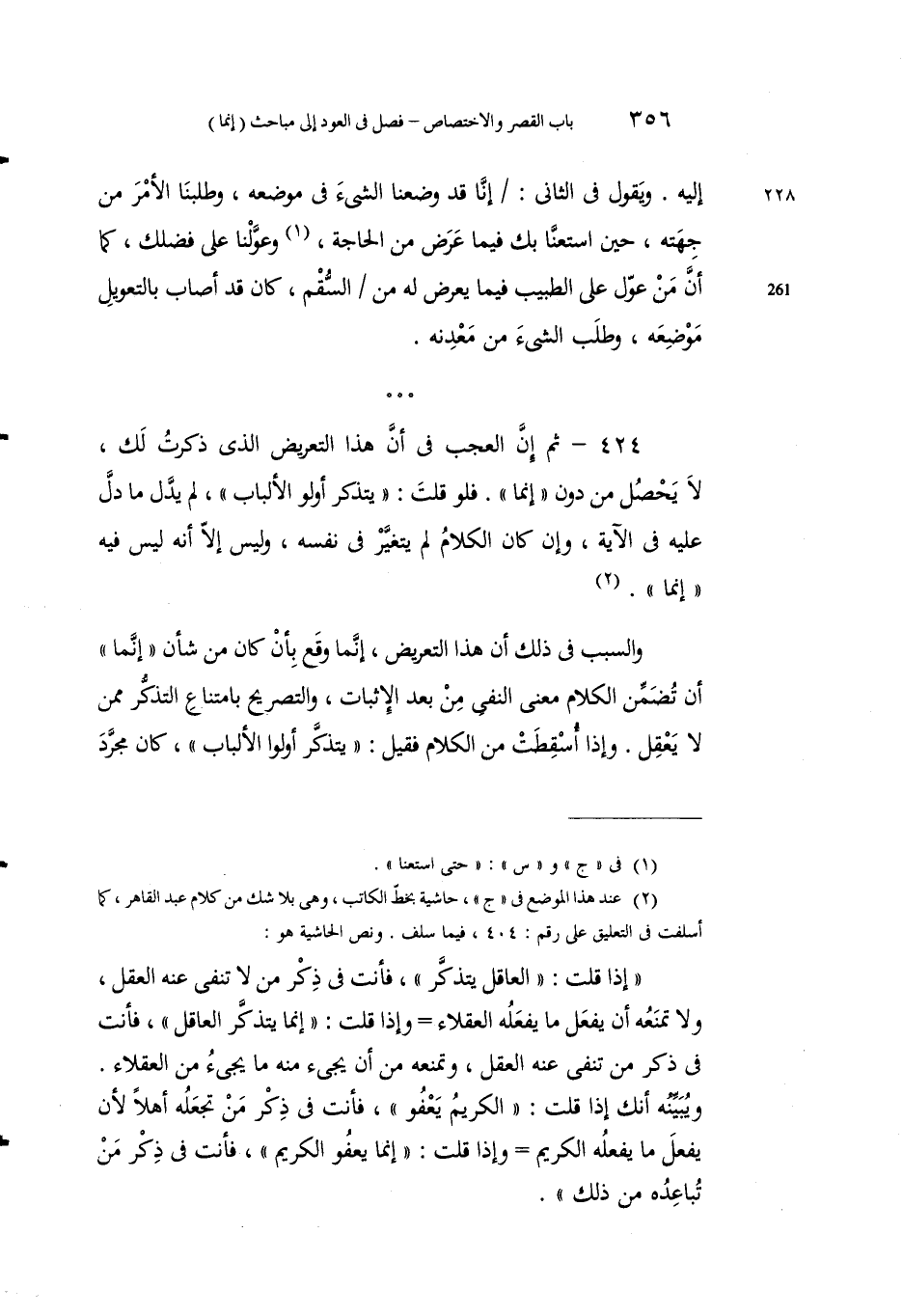 424 - ثم إنَّ العجَبَ في أنَّ هذا التعريضَ الذي ذكرتُ لكَ، لا يَحصُلُ من دُونِ "إِنما". فلو قلتَ: "يتذكَّرُ أُولو الألباب"، لم يدل ما دَلَّ عليه في الآية، وإنْ كان الكلامُ لم يتغيرْ في نفسِه، وليس إلاَّ أنهن ليس فيه "إِنما"2.