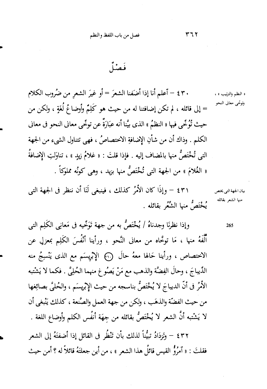 430 - إعْلَمْ أنَّا إذا أضفْنَا الشعرَ أو غيرَ الشعرِ من ضروب الكلامِ إلى قائلِهِ، لم تكنْ إضافتُنا له من حيثُ هو كَلِمٌ وأوضاعُ لغةٍ، ولكنْ من حيثُ تُوُخِّيَ فيها "النظمُ" الذي بيَّنا أنه عبارةٌ عن تَوخِّي معاني النحو في معاني الكلم. وذلك أنَّ مِنْ شأنِ الإضافةِ الاختصاصَ، فهي تتناولُ الشيءَ من الجهةِ التي تُختصُّ منها بالمضافِ إليه، فإذا قلتَ: "غلامُ زيدٍ"، تناولتِ الإضافةُ التي تُختصُّ منها بالمضافِ إليه، فإذا قلتَ: "غلامُ زيدٍ"، تناولتِ الإضافةُ "الغلامَ" من الجهة التي تختص منها بزيد، وهي كونه مملوكًا.