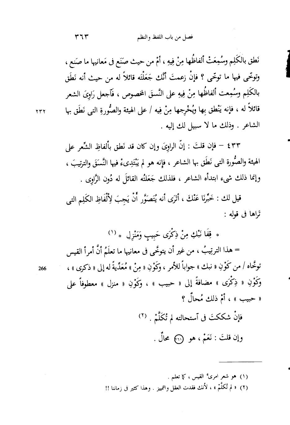 433 - فإِن قلتَ: إنَّ الراويَ وإنْ كان قد نطقَ بألفاظِ الشعرِ على الهيئةِ والصورةِ التي نطقَ بها الشاعرُ، فإنَّه هو لم يبتدئْ فيها النَّسَقَ والترتيبَ، وإنما ذلك شيءٌ ابتدأَهُ الشاعرُ، فلذلك جعلْتَه القائلَ له دونَ الراوي.