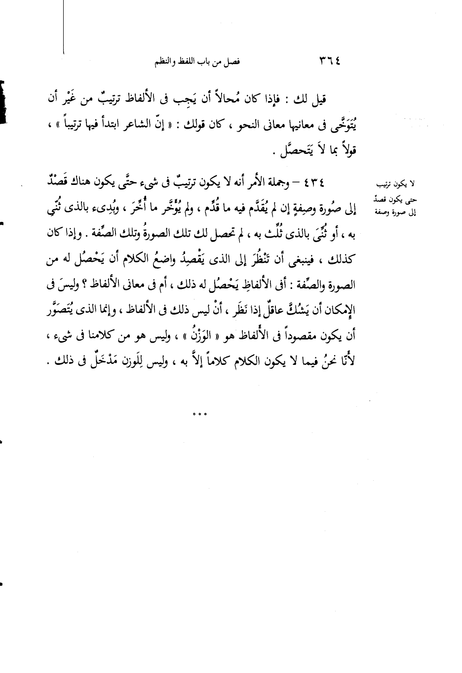 434 - وجملةُ الأمرِ أنَّه لا يكونُ ترتيبٌ في شيءٍ حتَّى يكونَ هناكَ قصْدٌ إلى صورةٍ وصنْعةٍ إنْ لم يُقدَّم فيه ما قُدِّم، ولم يُؤخَّر ما أُخِّر، وبُدئَ بالذي ثُنيَ به، أو ثنِّي بالذي ثُلِّث به، لم تحْصلْ لكَ تلكَ الصورةُ وتلك الصفة، وإذا كان كذلك، فينبغي أن تنظر إلى الذي يَقْصِدُ واضعُ الكلامِ أنْ يحصُلَ له من الصورةِ والصَّنعةِ: أفي الألفاظِ يَحصُلُ له ذلك، أم في معاني الأَلفاظِ؟ وليس في الإمكان أنت يَشُكَّ عاقلٌ إِذا نَظَر، أنْ ليس ذلك في الألفاظِ، وإنَّما الذي يُتصوَّرُ أنْ يكونَ مقصوداً في الألفاظِ هو "الوزنُ"، وليس هو مِنْ كلامِنا في شيءٍ، لأنَّا نحنُ فيما لا يكونُ الكلامُ كلاماً إلاَّ به، وليس لِلْوزنِ مدخلٌ في ذلك.