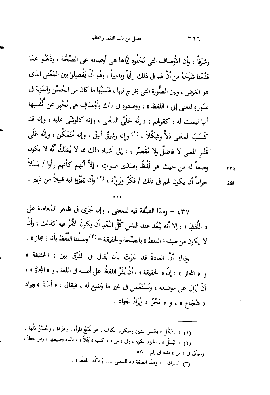 437 - وممَّا الصفةُ فيه للمعنى، وإنْ جرى في ظاهرِ المعاملةِ على "اللفظِ"، إلاَّ أنه يَبْعُد عند الناسِ كلَّ البعدِ أن يكونَ الأمرُ فيه كذلك، وأنْ لا يكونَ من صفةِ "اللفظِ" بالصحةِ والحقيقةِ3 وصْفُنا اللفظَ بأنه "مَجازٌ".