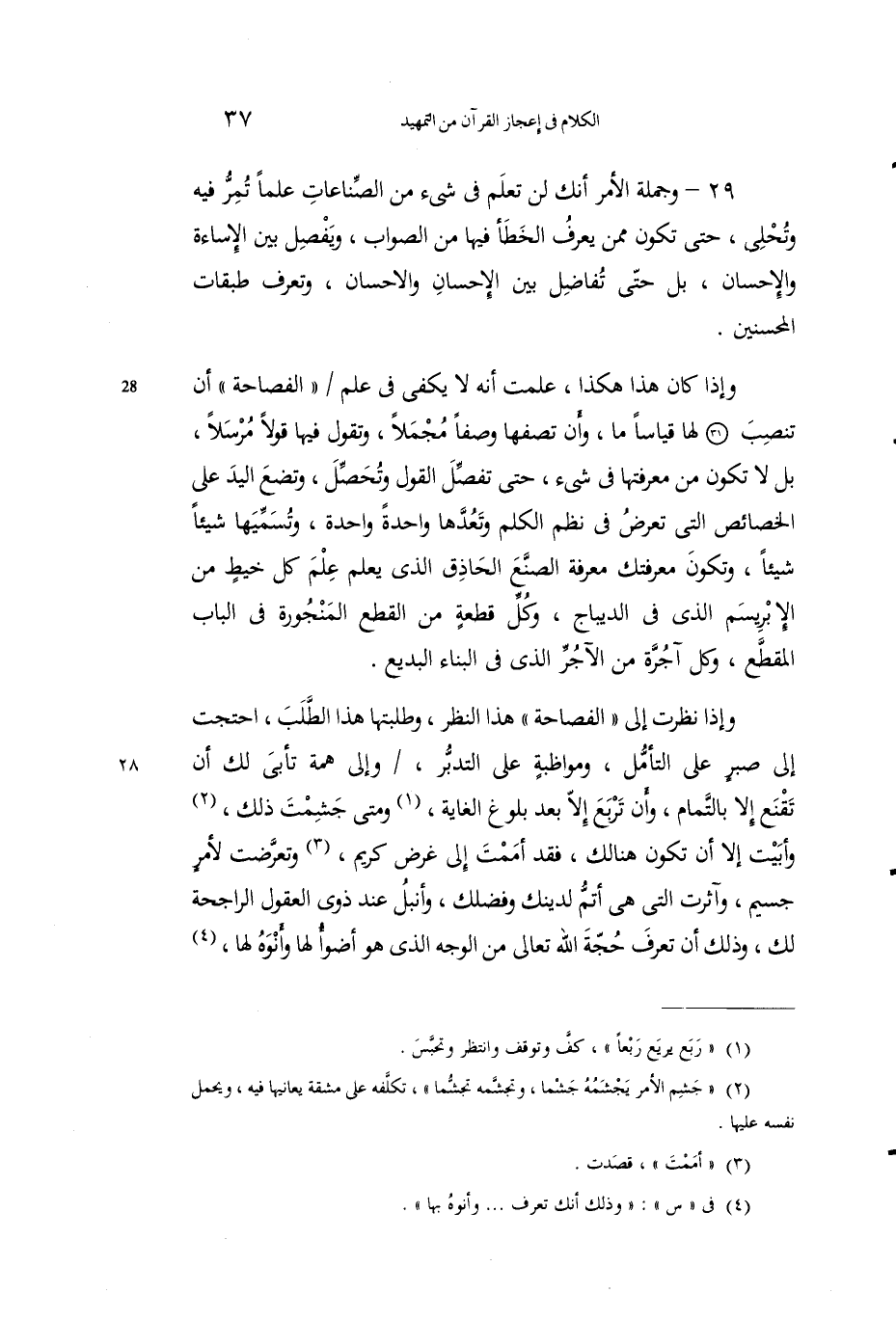 وإِذا نظرتَ إلى "الفصاحة" هذا النظرَ، وطلَبْتَها هذا الطلبَ، احتجْتَ إلى صبرٍ على التأمُّل، ومواظَبةٍ على التدبُّر، وإِلى هِمَّة تَأْبى لكَ أن تَقْنَع إلاَّ بالتَّمام، وأنْ تَرْبَعَ إلاَّ بَعْد بلوغِ الغاية1، ومتى جَشَّمْتَ ذلك2 وأَبيْتَ إِلاَّ أن تكونَ هنالك، فقد أَمَمْتَ إلى غرضٍ كَريم3، وتعرَّضْتَ لأمرٍ جَسيم، وآثَرْتَ التي هي أتَمُّ لدِينِكَ وفَضْلِك، وأَنْبَلُ عندَ ذوي العقول الراجحة لك، وذلك أنْ تَعرِفَ حُجَّة الله تعالى منَ الوَجْه الذي هو أَضْوَأُ لها وأنوه لها4،