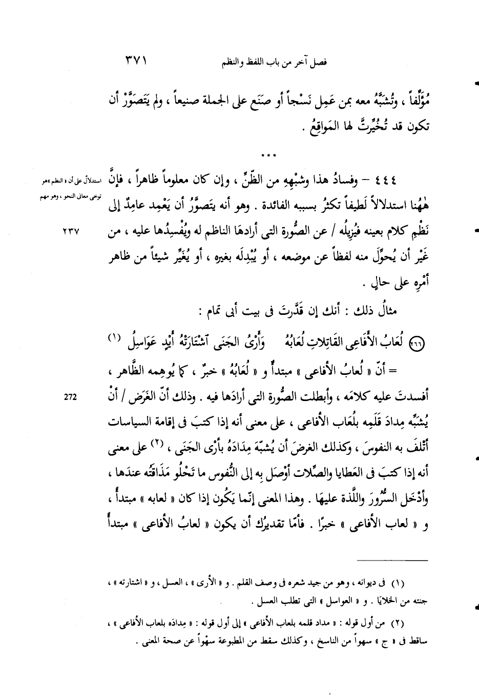 أنَّ "لعابَ الأفاعي" مبتدأٌ و "لعابُه" خبرٌ، كما يُوهِمُه الظاهر، أفسدْتَ عليه كلامَه، وأبطلْتَ الصورةَ التي أرادها فيه. وذلك أنَّ الغرضَ أنْ يُشَبِّه مداد قلمهِ بلعاب الأفاعي، على معنى أنه إذا كتب في إقامة السياسات أتلف به النفوس، وكذلك الغرضَ أنْ يُشَبِّه مِدادَهُ بأرْي الجنَي2، على معنى أنه إِذا كتَبَ في العطايا والصِلاتِ أوصَلَ به إلى النفوس ما تَحْلو مذاقَتُه عندها، وأدْخَل السرورَ واللذةَ عليها. وهذا المعنى إنما يكونُ إِذا كان "لعابُه" مبتدأ، و "لعاب الأفاعي" خبرًا، فأما تقديرك أنت يكون "لعاب الأفاعي" مبتدأ