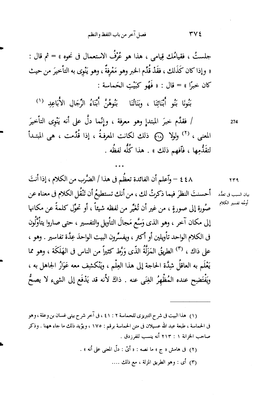 448 - واعلمْ أنَّ الفائدةَ تَعْظُم في هذا الضربِ من الكلامِ، إذا أنتَ أحسنْتَ النظَرَ فيما ذكرتُ لك، من أنكَ تستَطيعُ أنْ تَنقُلَ الكلامَ في معناه عن صورةٍ إلى صورةٍ، من غير أن تغير من لظفه شيئاً، أو تحوّلَ كلمةً عن مكانها إلى مكانٍ آخرَ، وهو الذي وَسَّعَ مجالَ التأويلِ والتفسيرِ، حتى صاروا يتأولون ي الكلام الواحدِ تأويلَيْنِ أوْ أكثر، ويُفَسِّرون البيتَ الواحدَ عدَّةَ تفاسيرَ. وهو، على ذاك3، الطريقُ المزلَّةُ الذي ورَّط كثيراً من الناس في الهَلَكة، وهو مما يَعْلم به العاقلُ شدَّةَ الحاجةِ إلى هذا العِلْم، وينْكشِفُ معه عُوَارُ الجاهلِ به، ويُفتضَحُ عنده المُظْهِرُ الغِنى عنه. ذاك لأنه قد يَدْفع إلى الشيءِ لا يصح