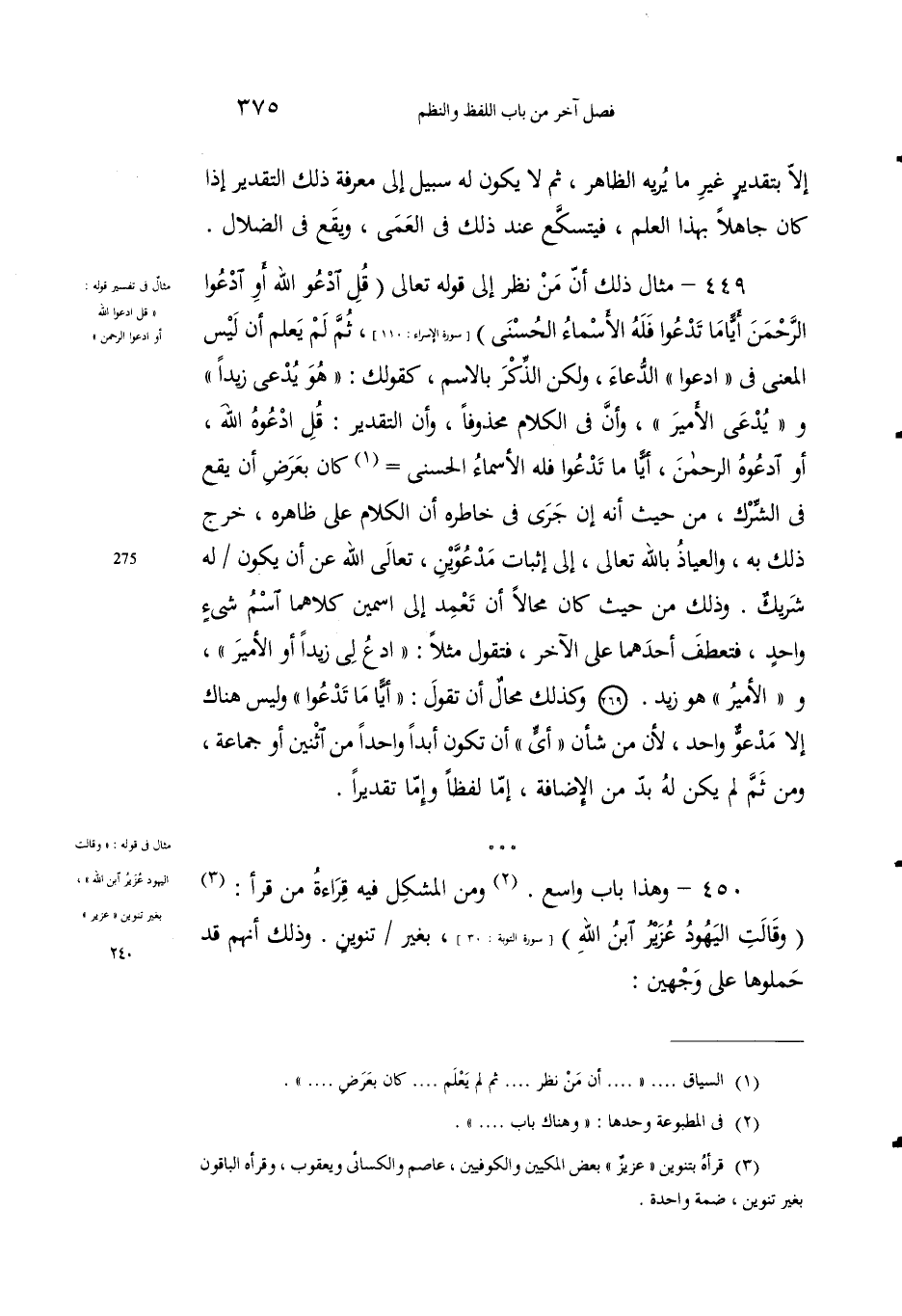 450 - وهذا بابٌ واسعٌ2. ومِن المُشْكِلِ فيه قراءةُ مَن قرأ3: {وَقَالَتِ الْيَهُودُ عُزَيْرُ ابْنُ اللَّهِ} [التوبة: 30]، بغيرِ تنوينٍ. وذلك أنَّهم قد حَملوها على وجهين:
