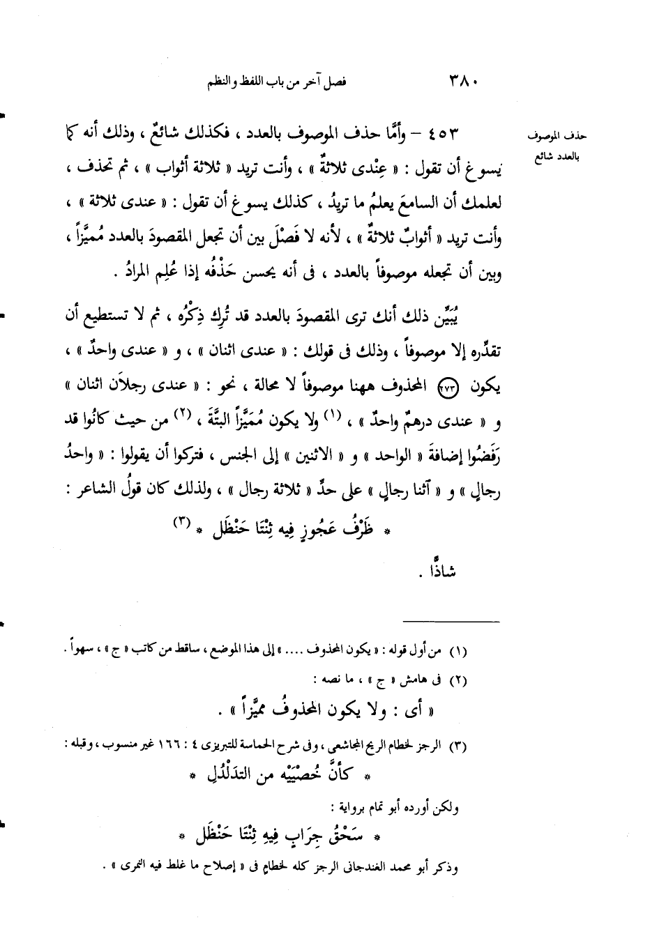 453 - وأما حذْفُ الموصوفِ بالعدد، فكذلك شائعٌ، وذلك أَنه كما يَسوغُ أن تقولَ: "عندي ثلاثة"، وأنتَ تريدُ "ثلاثةَ أثوابٍ"، ثم تَحذفُ، لعِلْمكَ أنَّ السامعَ يَعْلمُ ما تُريد، كذلك يسَوغُ أنْ تَقولَ: "عندي ثلاثةٌ"، وأنت تُريد "أثوابٌ ثلاثة"، لأنه لا فَصْلَ بين أن تَجْعَل المقصودَ بالعددِ مميَّزاً، وبين أنْ تَجعلَهُ موصوفاً بالعدد، في أَنه يَحْسُنُ حذْفُه إِذا عُلِمَ المراد.