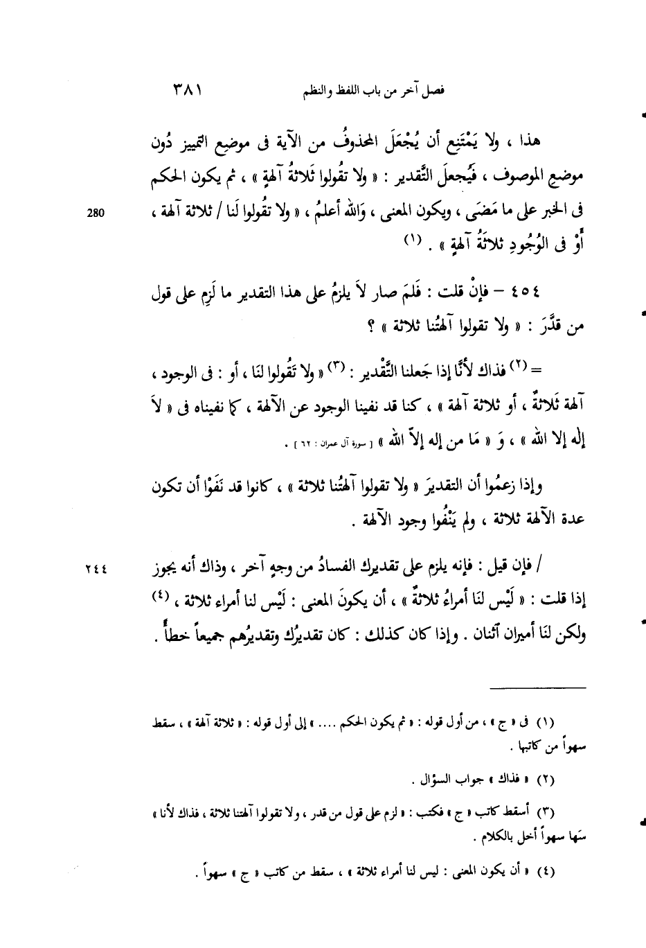 3 أسقط كاتب "ج" فكتب "لَزِمَ عَلَى قولِ مَنْ قدَّر، ولا تَقولوا آلهتنا ثلاثة، فذاك لأنا". سها سهوًا أخل بالكلام.