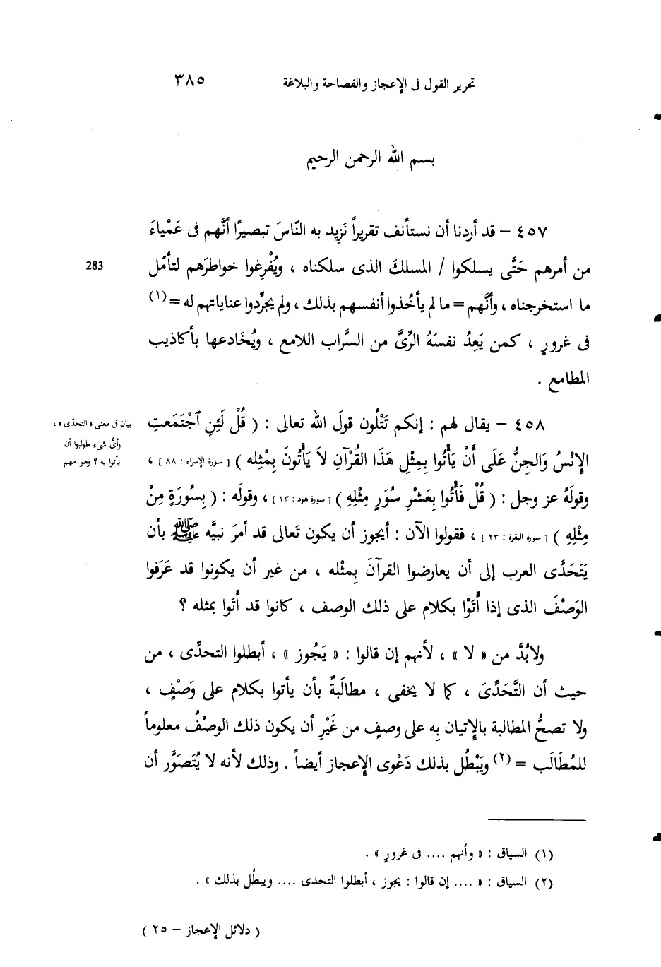 ولا بُدَّ من "لا"، لأنَّهم إنْ قالوا: "يجوزُ"، أبطلوا التحدِّي، من حيث إنَّ التحدي -كما لا يخفى- مطالبةٌ بأن يأتوا بكلامٍ على وصفٍ، ولا تصحُّ المطالبةُ بالإِتيان به على وصفٍ من غيرِ أن يكونَ ذلك الوصفُ معلوماً للمطالَبِ2 ويبطلُ بذلك دعوى الإِعجاز أيضاً؛ وذلك لأنه لا يتصور أن