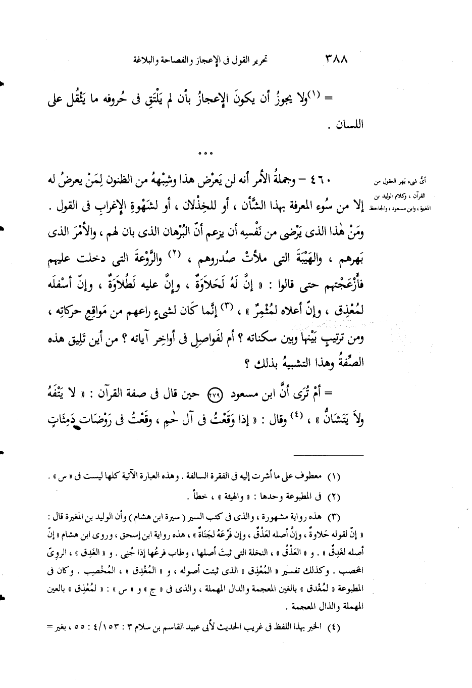 460 - وجملةُ الأمرِ أَنه لَن يَعرِضَ هذا وشَبهُهُ من الظنونِ لِمَنْ يَعرِضُ لهُ إلاَّ مِن سوءِ المعرفةِ بهذا الشأنِ، أوْ للخذلانِ، أو لِشهوةِ الإِغرابِ في القولِ. ومَنْ هذا الذي يَرْضى مِنْ نَفْسه أنْ يَزعمَ أنَّ البرهانَ الذي بان لهم، والأمر الذي بهرهم، والهيبة التي ملأتْ صدُورَهم1، والروعةَ التي دخلتْ عليهم فأزعَجَتْهم حتَّى قالوا: "إنَّ له لحلاوةً، وإنَّ عليه لطولاة، وأن أسفله لمعذق، وإنَّ أعلاه لَمْثْمِرٌ2، إنما كان لِشيءٍ راعَهُم من مَواقعِ حركاتِه، ومِن تَرتيبٍ بيْنَها وبَيْنَ سكناته؟ أم لِفَواصلَ في أواخرِ آياته؟ مِنْ أَيْنَ تَليقُ هذه الصفةُ وهذا التشبيهُ بذلك؟