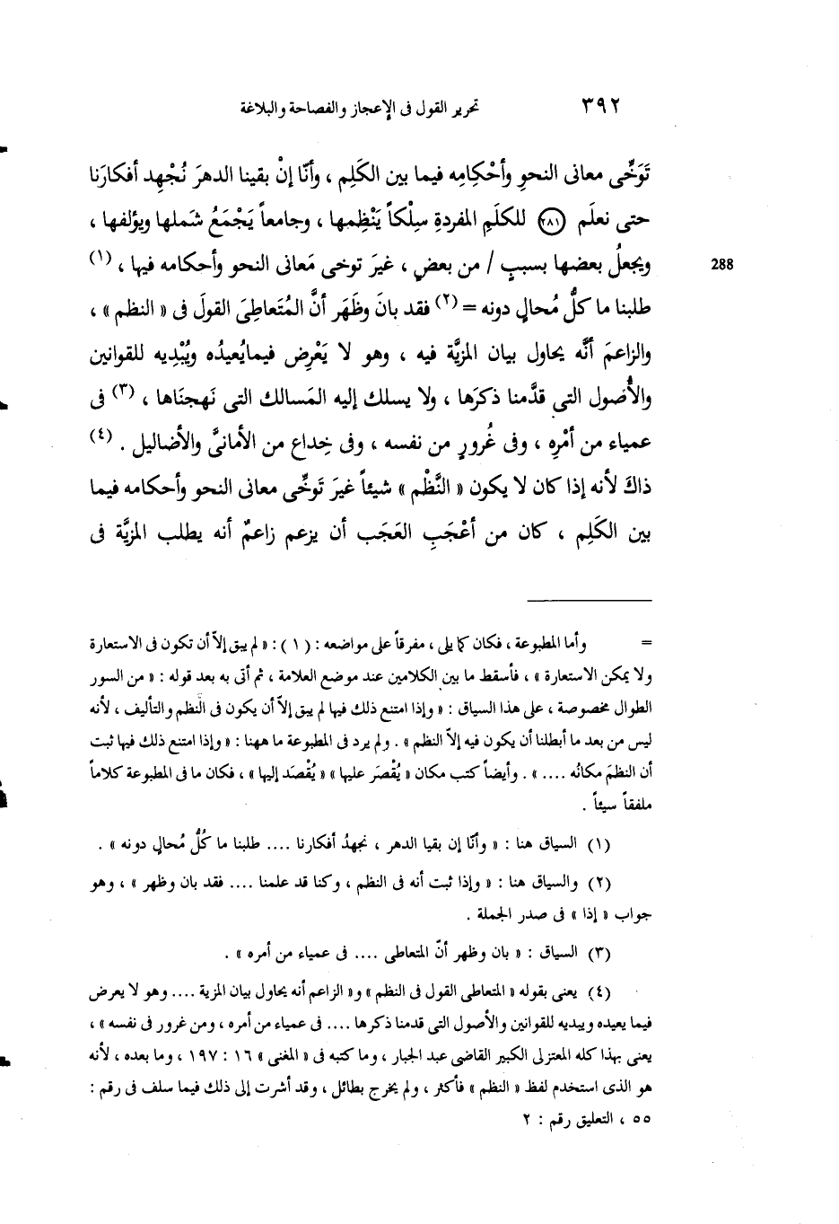 4 يعني بقوله "المتعاطي القول في النظم" و"الزاعم أنه يحاول بيان المزية .... وهو لا يعرض فيما يعيده ويبديه للقوايين والأصول التي قدمنا ذكرها ... في عمياء من أمره، ومن غرور في نفسه"، يعني بهذا كله المعتزلي الكبير القاضي عبد الجبار، وما كتبه في "المغني" 16: 197، وما بعدها؛ لأنه هو الذي استخدام لفظ "النظم"، فأكثر، ولم يخرج بطائل، وقد أشرت إلى ذلك فيما سلف في رقم: 55، التعليق رقم: 2.