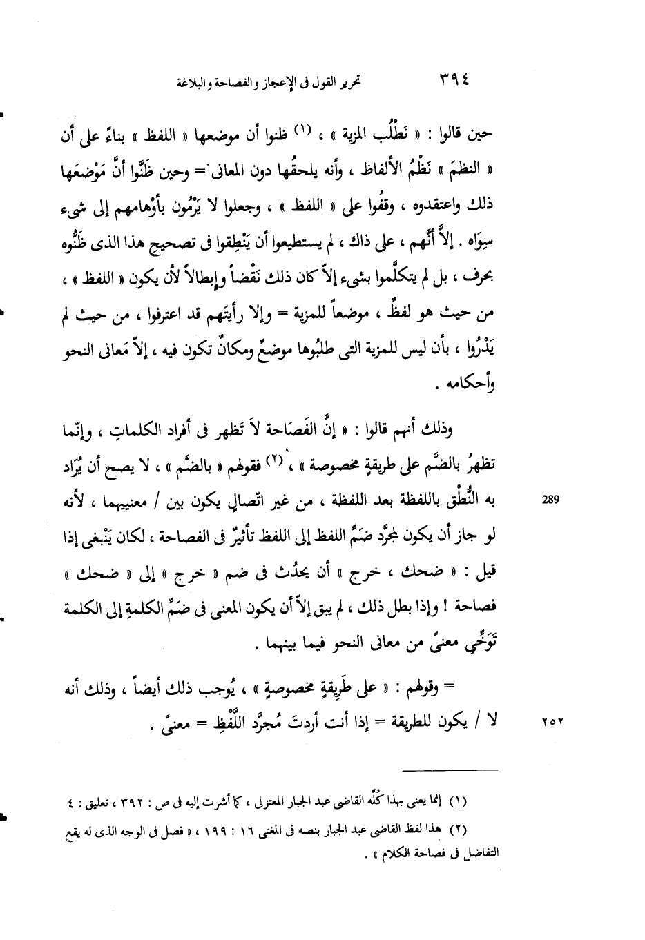 2 هذا لفظ القاضي عبد الجبار بنصه في المغني 16: 199، "فصل في الوجه الذي له يقع التفاضل في فصاحة الكلام".